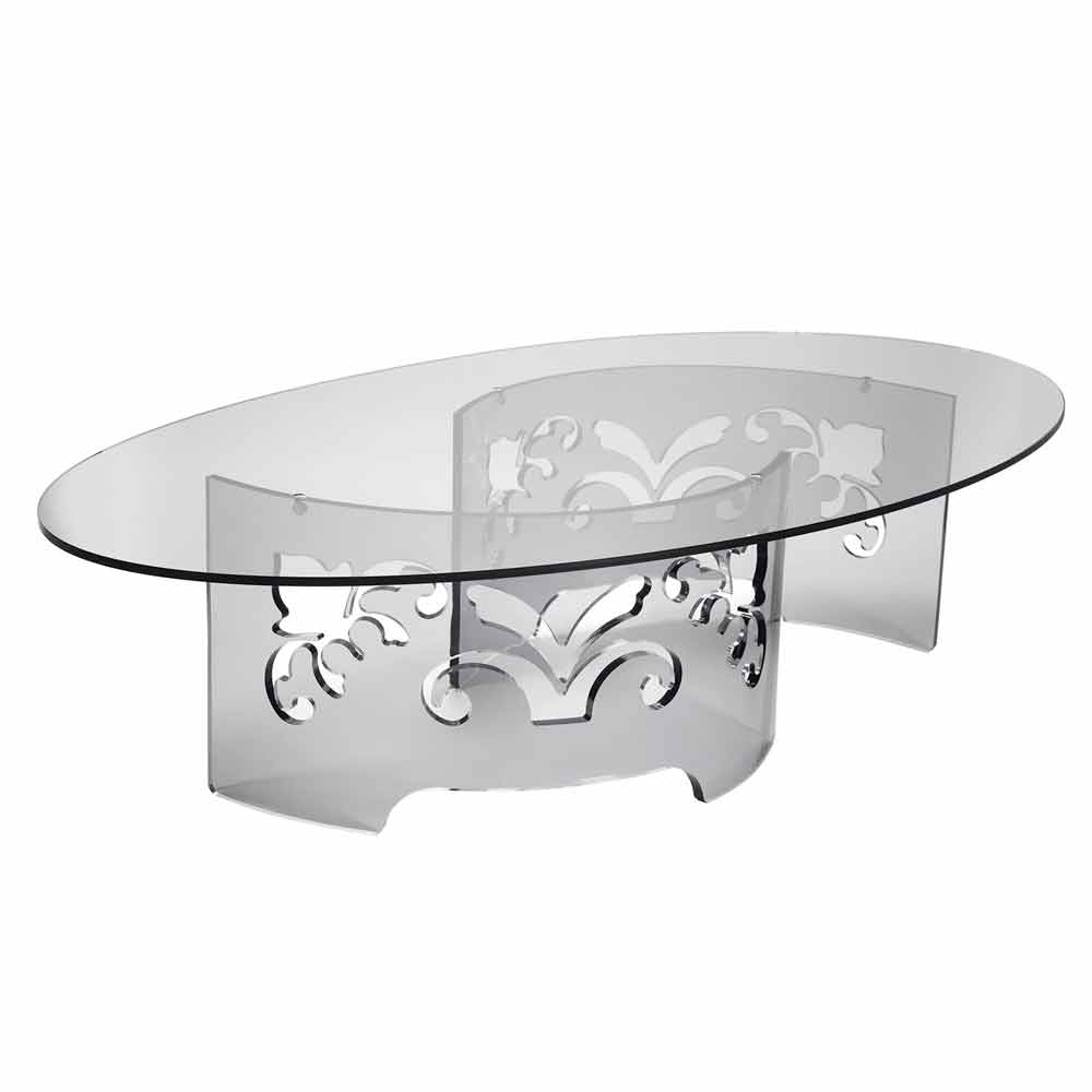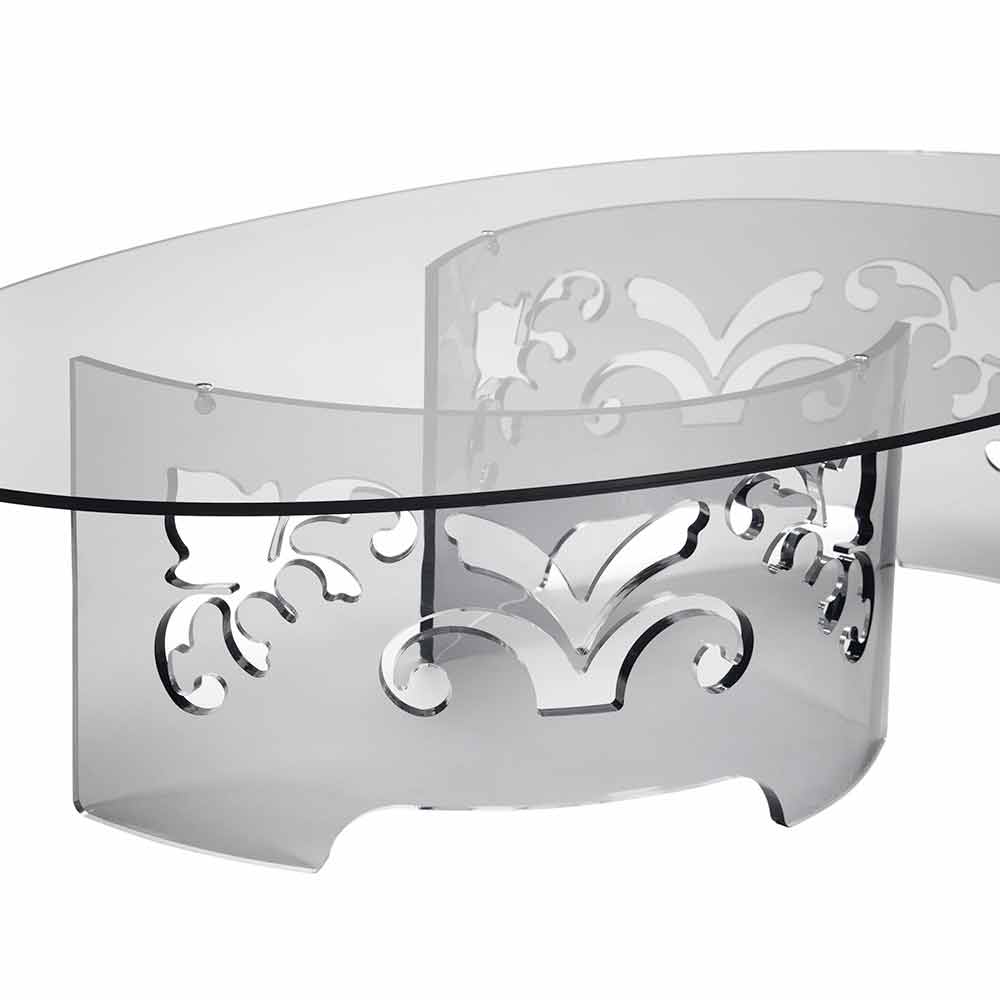 Ovaler Couchtisch aus transparentem oder geräuchertem Plexiglas mit lasergeschnitztem, dekoriertem Boden aus Italien.