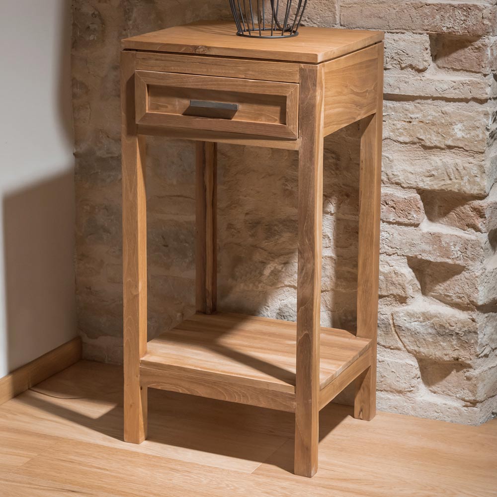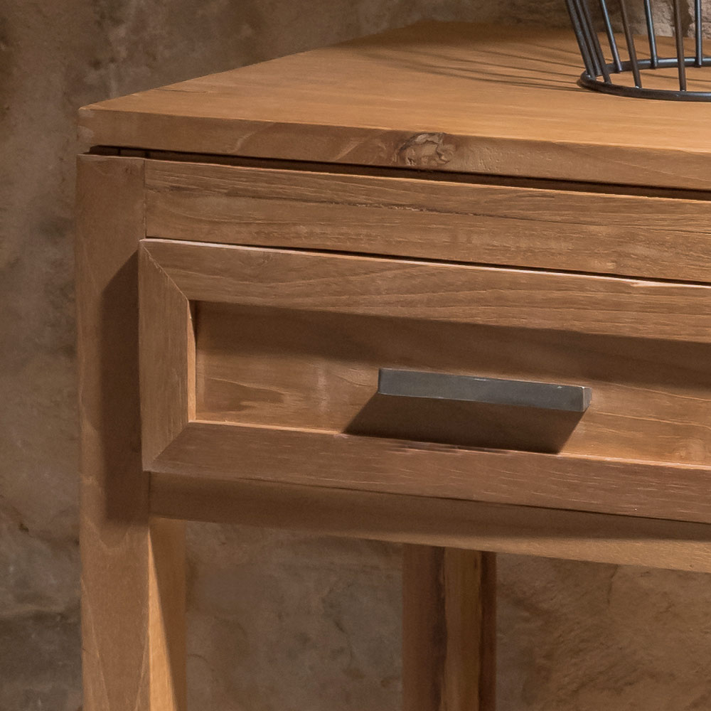 Dieser Couchtisch aus massivem Teakholz ist ein kompaktes und vielseitiges Möbelstück, ideal als Beistelltisch, Nachttisch oder Nachttisch. Die handwerkliche Verarbeitung und die natürliche Holzmaserung verleihen ihm einen authentischen und zeitlosen Look, der sich perfekt in jeden Raum Ihres Zuhauses einfügt.
