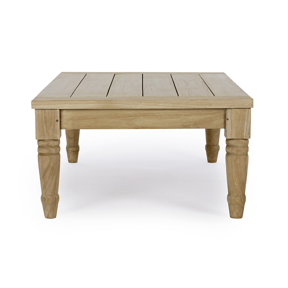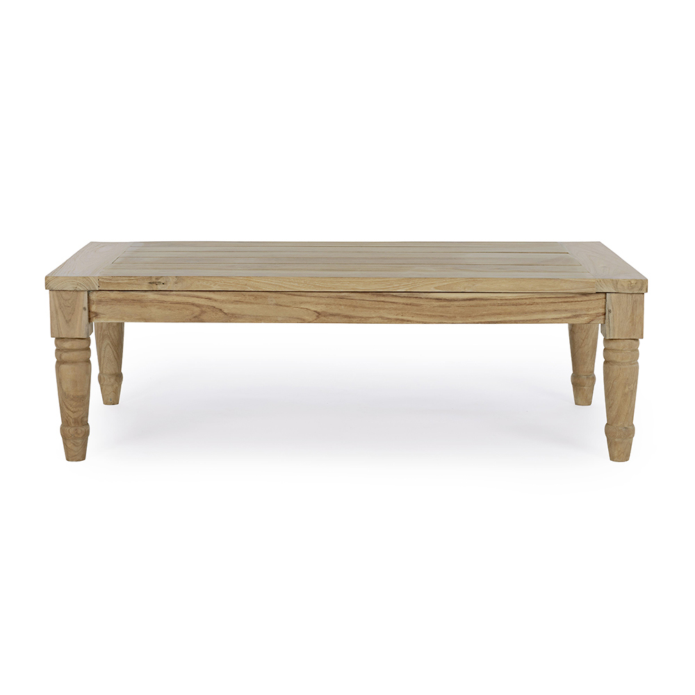 Rechteckiger Außen-Couchtisch aus Teakholz mit rustikalem Finish.