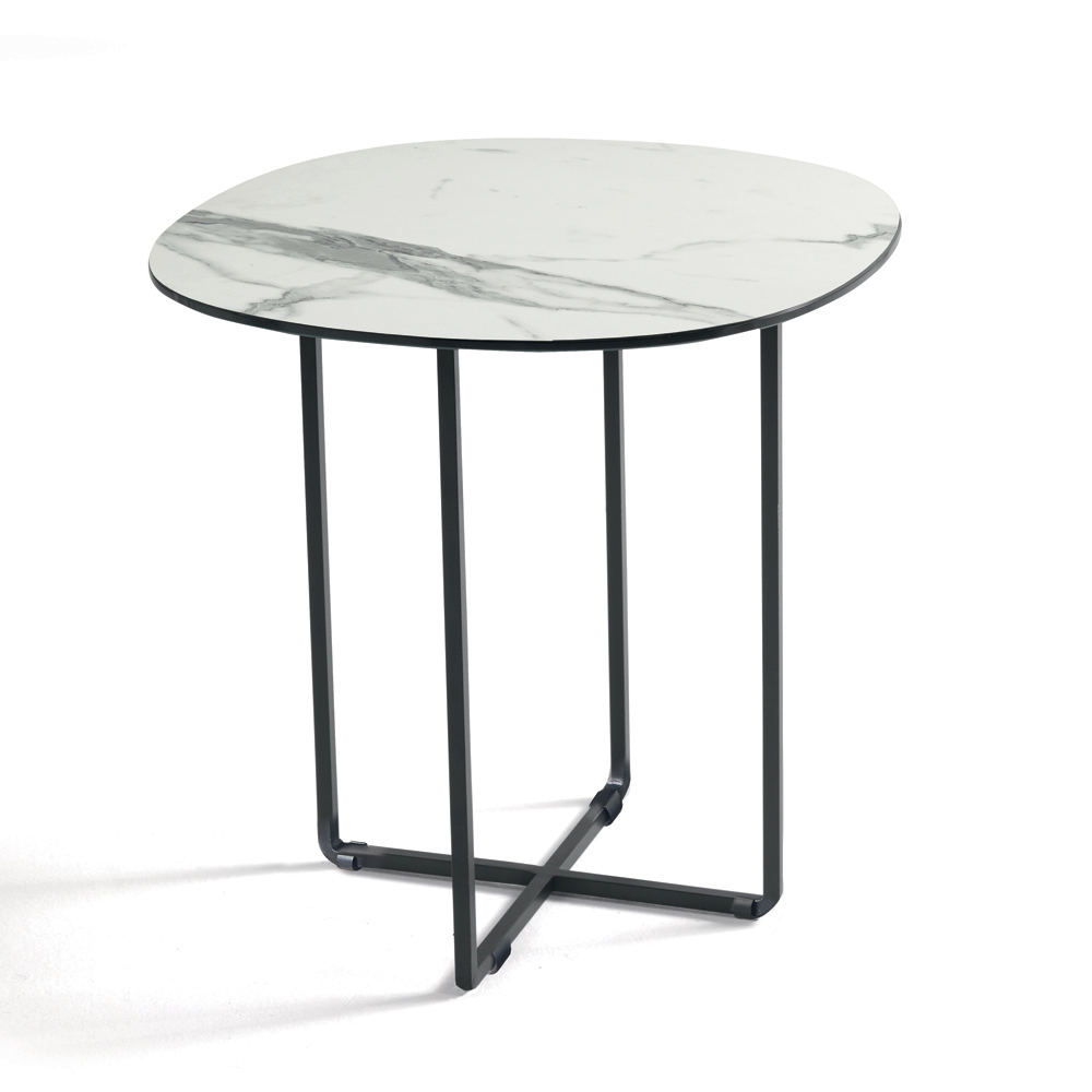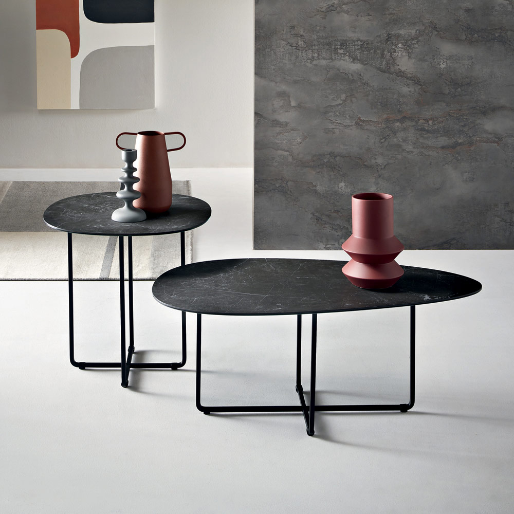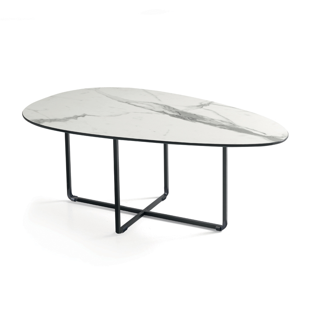 Das Gestell aus lackiertem Metall ist robust und wirkt dennoch optisch leicht. Es fügt sich harmonisch in moderne Räume ein. Die klaren, wohlproportionierten Formen verleihen dem Tisch eine elegante und zeitlose Ästhetik, die ihn für verschiedenste Einrichtungsstile perfekt geeignet macht.