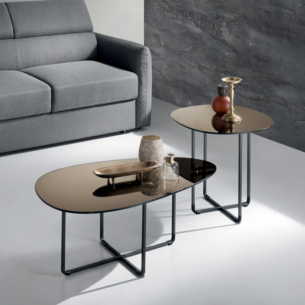Die Tischplatte ist wahlweise aus Spiegelglas , das den Raum heller wirken lässt, oder aus einer mit Marmoroptik versehenen Keramikschicht auf Glas erhältlich – eine Lösung, die Langlebigkeit und ästhetische Eleganz vereint. Dank dieser zwei Optionen können Sie den Tisch individuell an den Stil Ihres Zimmers anpassen.