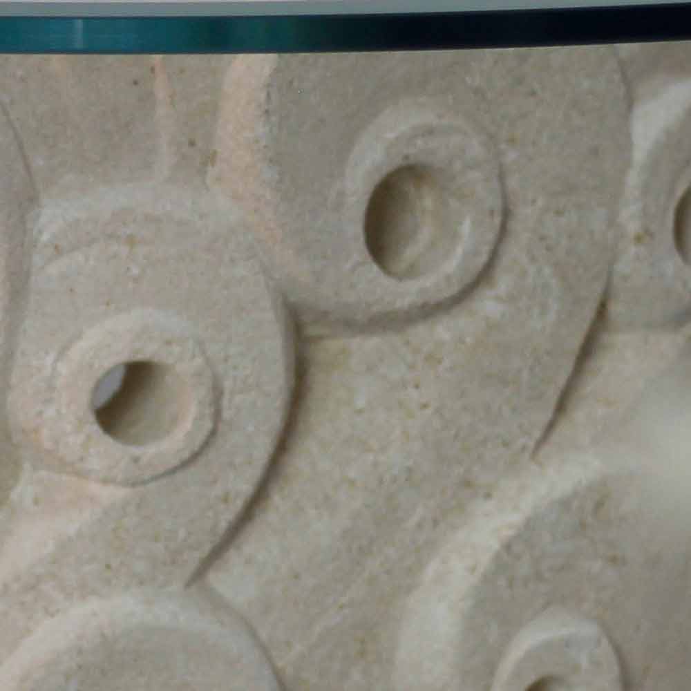 Die Basis ist aus Naturstein aus Vicenza hergestellt und wird von Hand bearbeitet. Die Tischplatte besteht aus Kristall float mit einer Dicke von 12 mm und ist an dem Stein mit einem Flansch befestigt.
