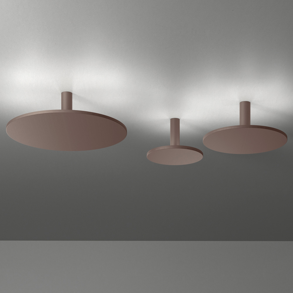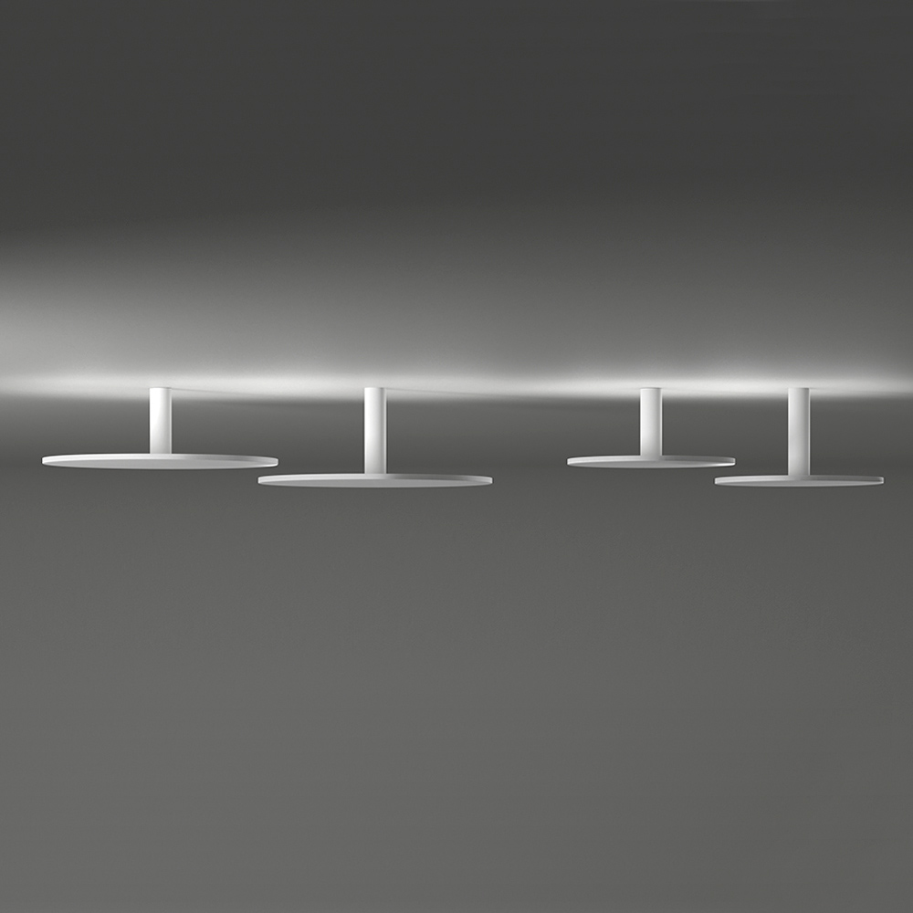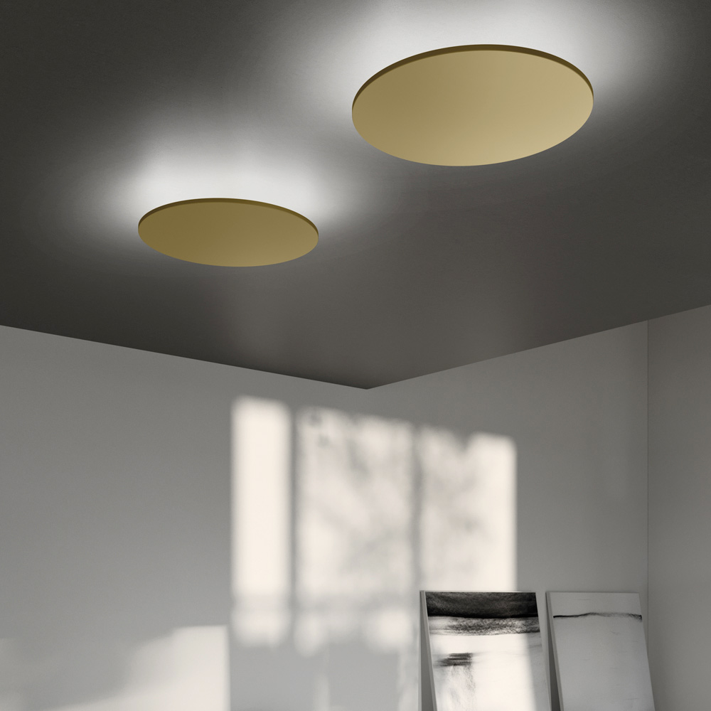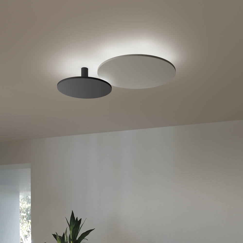 Diese Deckenleuchte ist ein raffiniertes Beispiel für zeitgenössisches Design , bei dem Geometrie und Licht zu einem subtilen, aber wirkungsvollen Bühneneffekt verschmelzen. Durch die Möglichkeit, Kompositionen aus überlappenden Scheiben unterschiedlicher Größe und Ausführung zu erstellen, entsteht ein indirektes, diffuses Licht, das die Umgebung mit Eleganz und optischer Harmonie aufwertet.