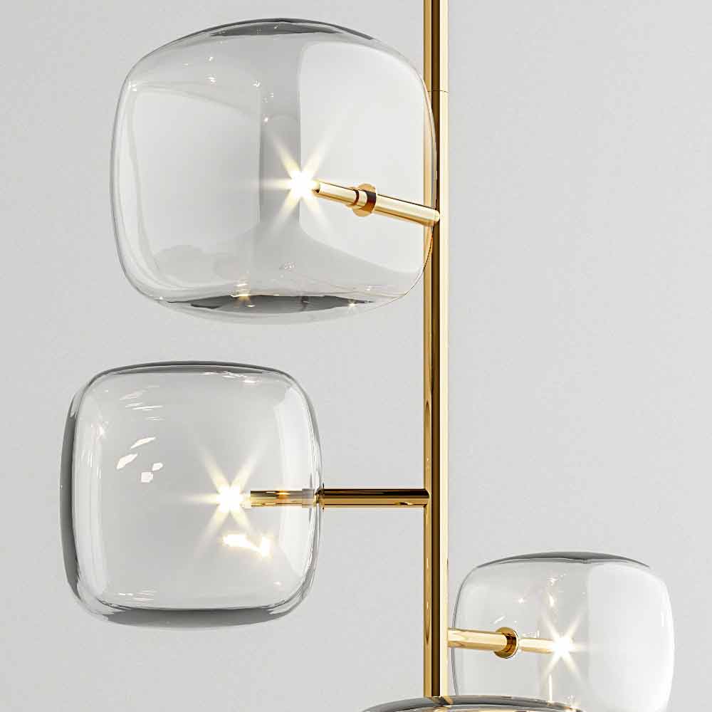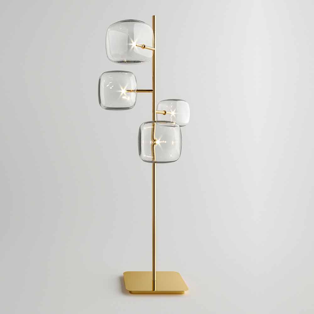 Die Stehlampe ist ein grundlegendes Element in jedem Haus, da sie zwei Funktionen erfüllt: einen Lichtpunkt zu erzeugen und gleichzeitig die Umgebung zu dekorieren. Diese Stehlampe wird in Italien hergestellt und repräsentiert eine äußerst elegante und wirkungsvolle Beleuchtungsidee, die dazu beiträgt, eine Umgebung mit einer raffinierten und modernen Atmosphäre zu schaffen. Die glänzende Metallstruktur umfasst würfelförmige Dekorationen mit abgerundeten Ecken aus transparentem geblasenem Pyrexglas mit G4 3000K LED-Licht und dimmbarer Glühbirne.