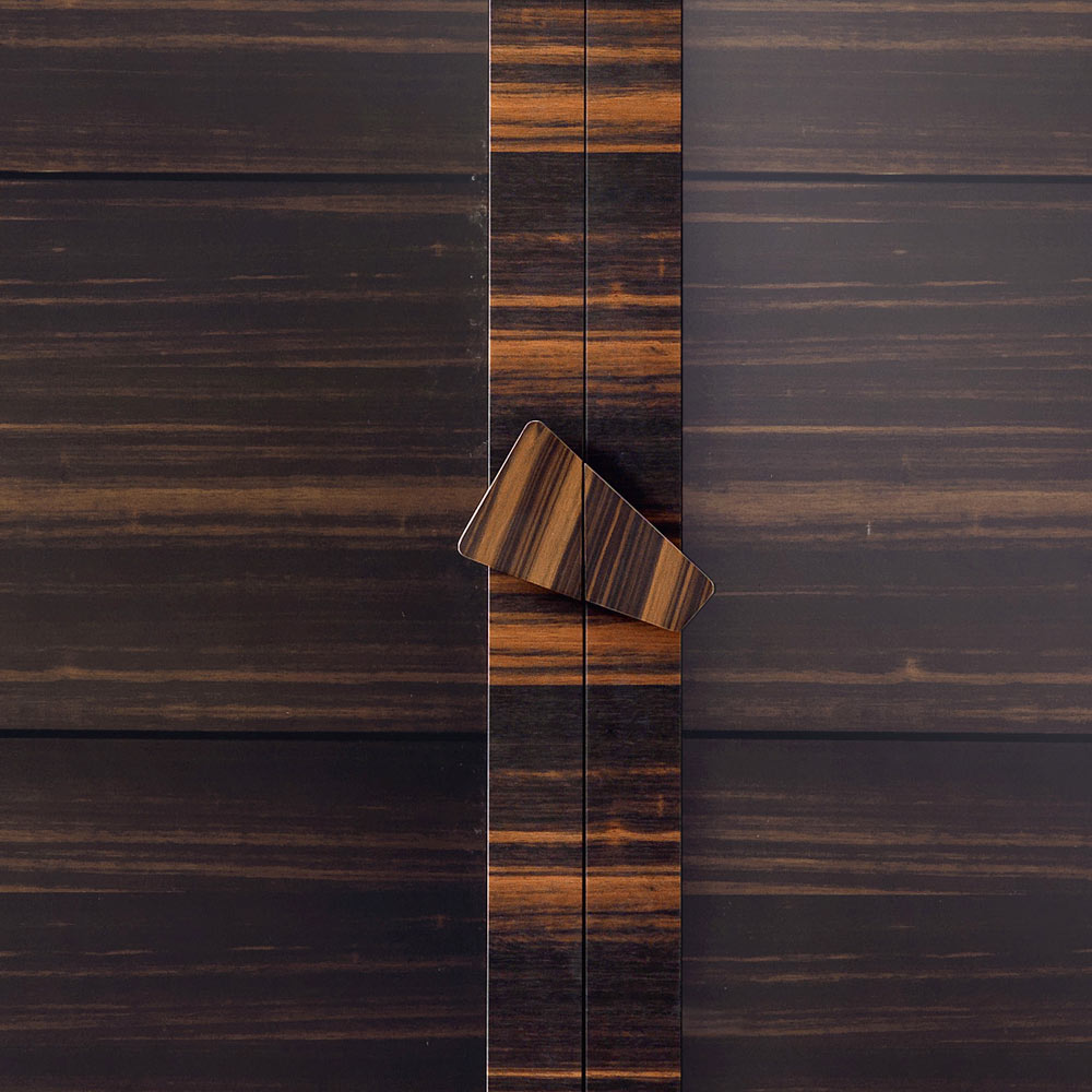 Die Vitrine hat eine mehrschichtige Struktur und einen massiven Holztulipier mit Ebenholz furniert. Die Basis ist aus lackiertem touliper Massivholz. Im Inneren befinden sich einige Regale aus Rauchglas, während die interne Schubladeneinheit auf Anfrage erhältlich ist .