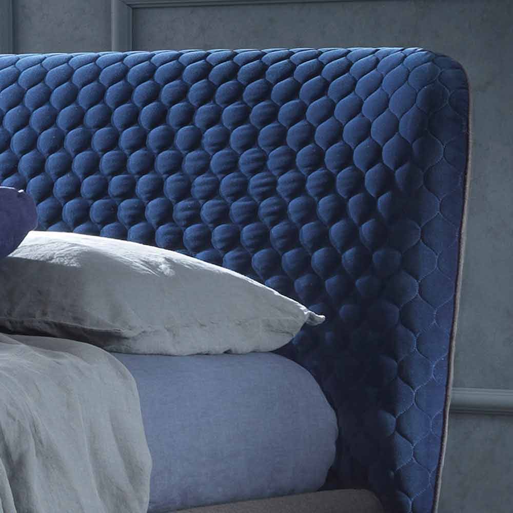 Doppelbett mit Container, Corolle von Bolzan Das Doppelbett Corolle mit zeitgenössischem Design hat eine geschwungene Linie, die mit einer sorgfältigen Farbauswahl verflochten ist. Weiche Linien, die wir auch in der Textur des Kopfteils finden. Der Behälter hat eine Struktur aus Holzagglomerat mit einer synthetischen Innenbeschichtung in Tannenoptik, die durch Profile aus expandiertem Polyurethan und Rohren gestützt wird. Es ist vollständig abnehmbar. Die Struktur besteht aus Tannenholzstreifen mit einer natürlichen Innenbeschichtung H.29 und ist mit Polyurethanschaum ohne Fluorchlorkohlenwasserstoffe gemäß UNI-Normen überzogen und mit lichtbeständigem Velfodera ausgekleidet. Die Böden der Struktur bestehen aus Holzagglomerat mit einer synthetischen Innenbeschichtung in Tannenoptik, letztere werden von PE- und Rohrprofilen gestützt. Die Innenhöhe der Box beträgt 18 Zentimeter. Lattenrost mit Metallstruktur, gebogener Rahmen mit 50x37 mm Profil, lackiert mit Epoxidpulver. Normaler orthopädischer Lattenrost, gebogene Latten aus Buchensperrholz Vasenfüße h.4 cm