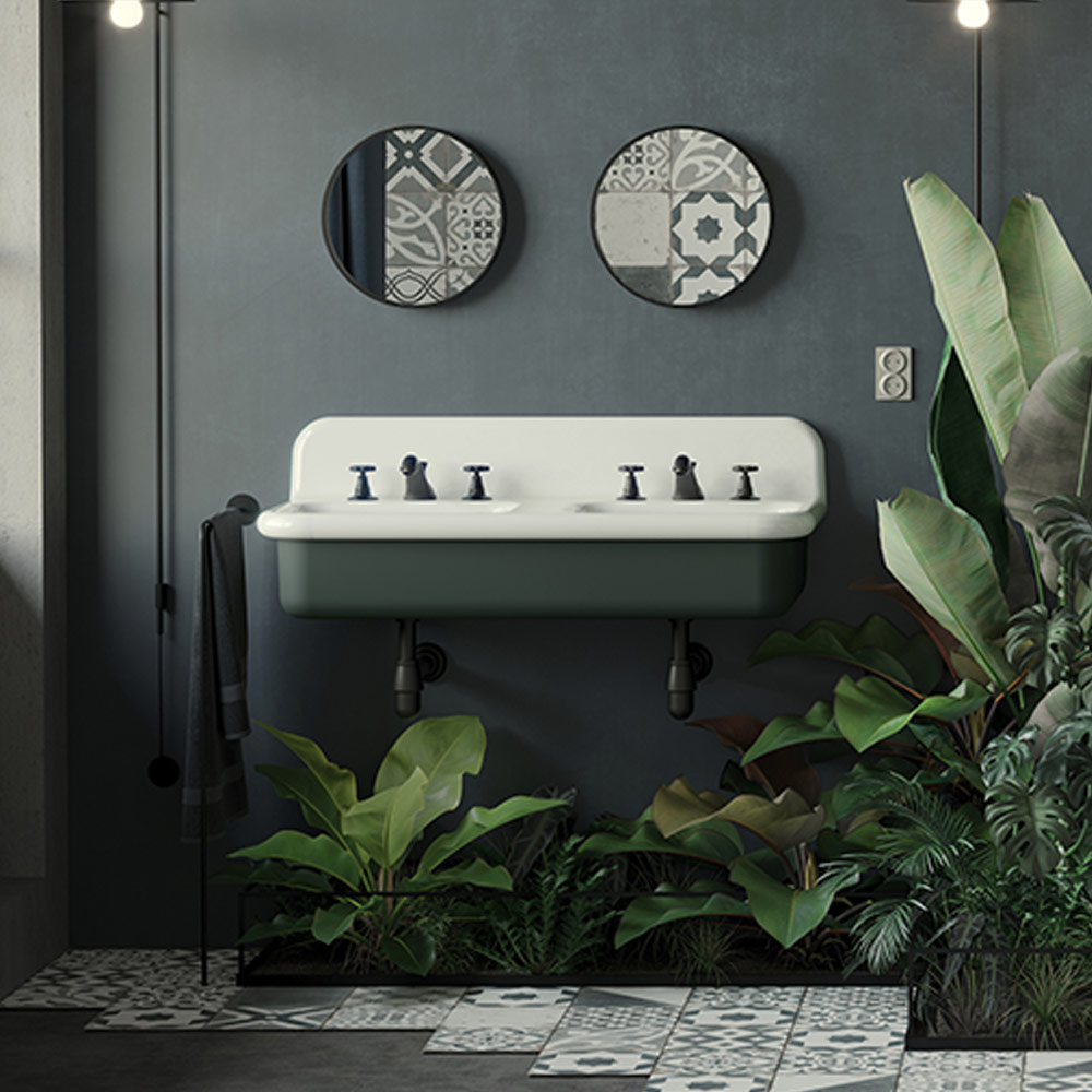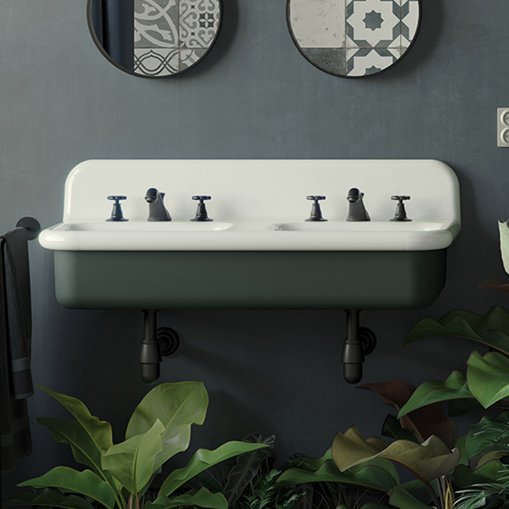 Doppeltes Badezimmerwaschbecken mit rechteckiger Struktur aus zweifarbiger mattweißer und waldgrüner Keramik .