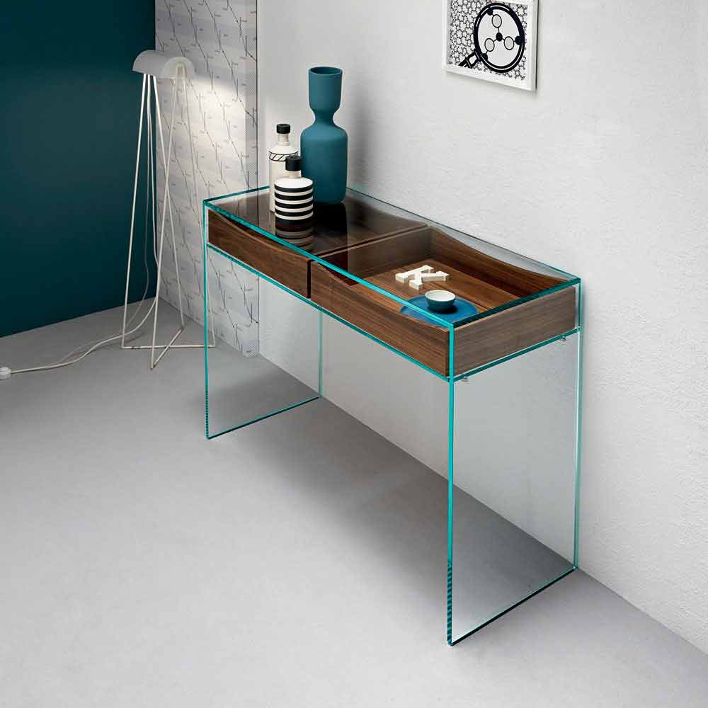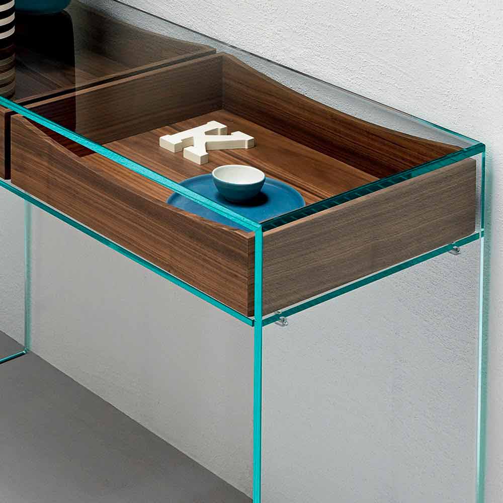 Die Konsole ist ein in verschiedenen Kontexten quer einsetzbares Möbelstück mit einer schlichten und geradlinigen Brückenstruktur aus extra klarem Glas mit zwei darunter liegenden Schubladen in Nussbaum Canaletto.