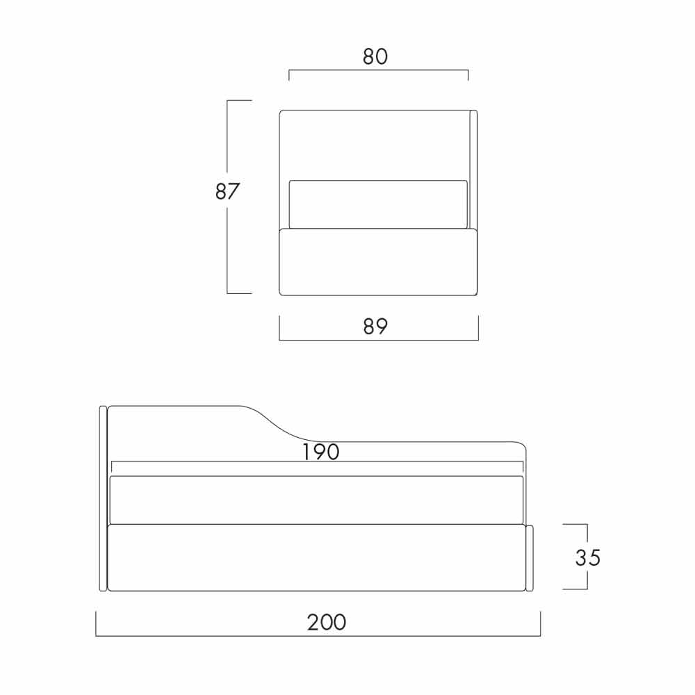 Einzelbett mit geformtem Kopfteil, Linie 8 von Bolzan, hergestellt in Italien Line ist ein raffinierter Klassiker mit markanten und schlichten Merkmalen. Seine Komposition ist zart und passt sich jeder Umgebung an. Line folgt stilistischen und funktionalen Entwicklungen. Das Einzelbett Line 8 hat einen Rahmen aus Eisen und Rohholzfaser, der mit Polyurethanschaum ohne Fluorchlorkohlenwasserstoffe gemäß UNI-Normen überzogen und mit lichtbeständigem Velfodera ausgekleidet ist. Auf dieser Basis ist ein 30 mm hoher, mit duroplastischem Epoxidpulver lackierter Metallrahmen mit einem Lattenrost aus dampfgebogener Buche montiert. Das Bett ist in folgenden Größen erhältlich: - 80x190 cm (Fertigmaße L 91 x T 200 x H 87 cm) -90x200 cm (Fertigmaße L 101 x T 210 x H 87 cm)