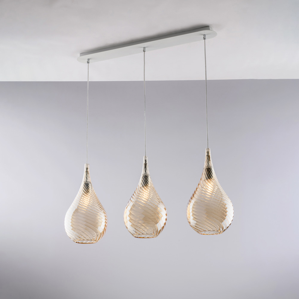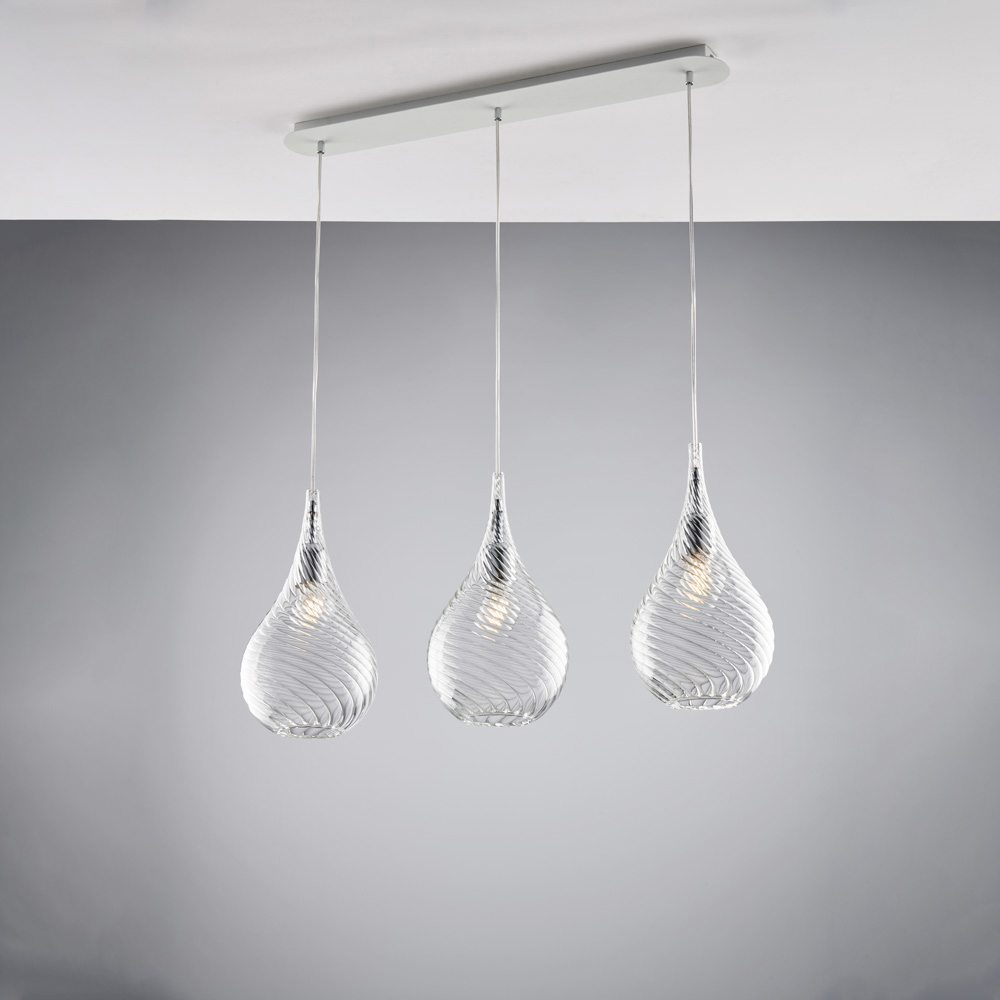 Diese elegante und funktionale, handgefertigte Pendelleuchte aus Eisen mit Pyrex-Glas ist eine moderne Beleuchtungslösung, die Räumen Ausgewogenheit und Leichtigkeit verleiht. Die drei geschwungenen und eleganten Pyrex-Glasdiffusoren hängen an einer linearen Schiene, die für eine gleichmäßige Lichtverteilung und eine starke ästhetische Wirkung sorgt.