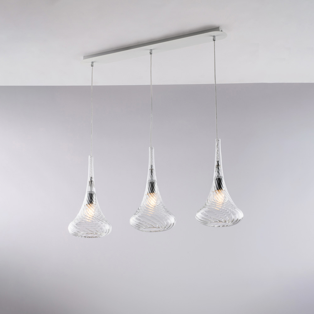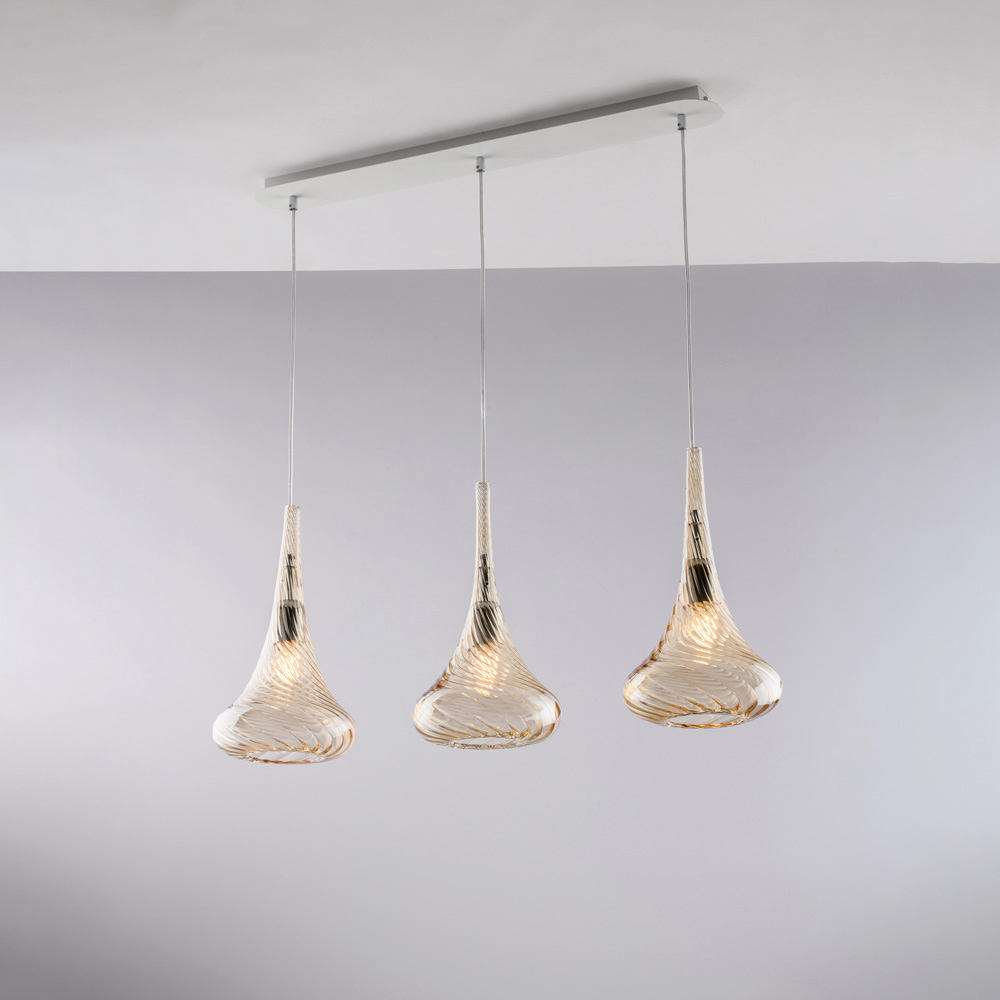 Diese Pendelleuchte ist in den Ausführungen Transparent , Bernstein oder Grau erhältlich und ermöglicht es Ihnen, die Atmosphäre Ihres Raumes individuell zu gestalten: hell und minimalistisch in der transparenten Version, warm und behaglich in Bernstein, elegant und modern in Grau. Sie eignet sich perfekt für Kücheninseln , Esstische , Theken , offene Wohnbereiche und exklusive Objekträume .