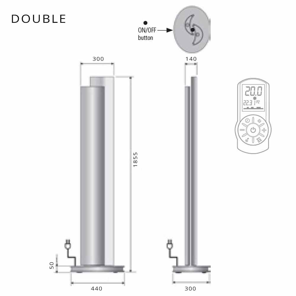 Diese Heizung hat eine Leistung von 250 Watt für die Einzelversion und 500 Watt für die Doppelversion und wird mit einer Standardfernbedienung zum Einstellen der LED-Leuchten und des Thermostats mit täglicher / wöchentlicher Programmierung geliefert. 1,5 m Kabel mit Schuko-Stecker. Einphasige 230-Volt-Stromversorgung.