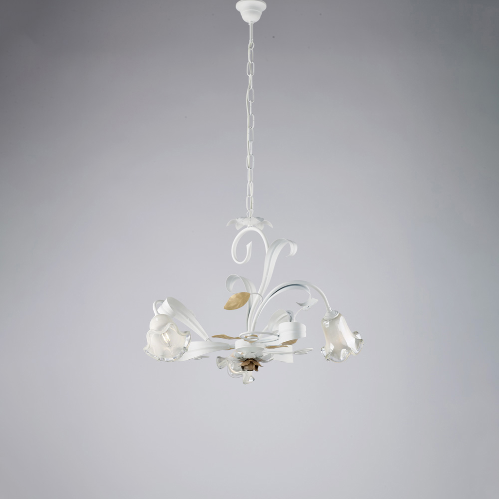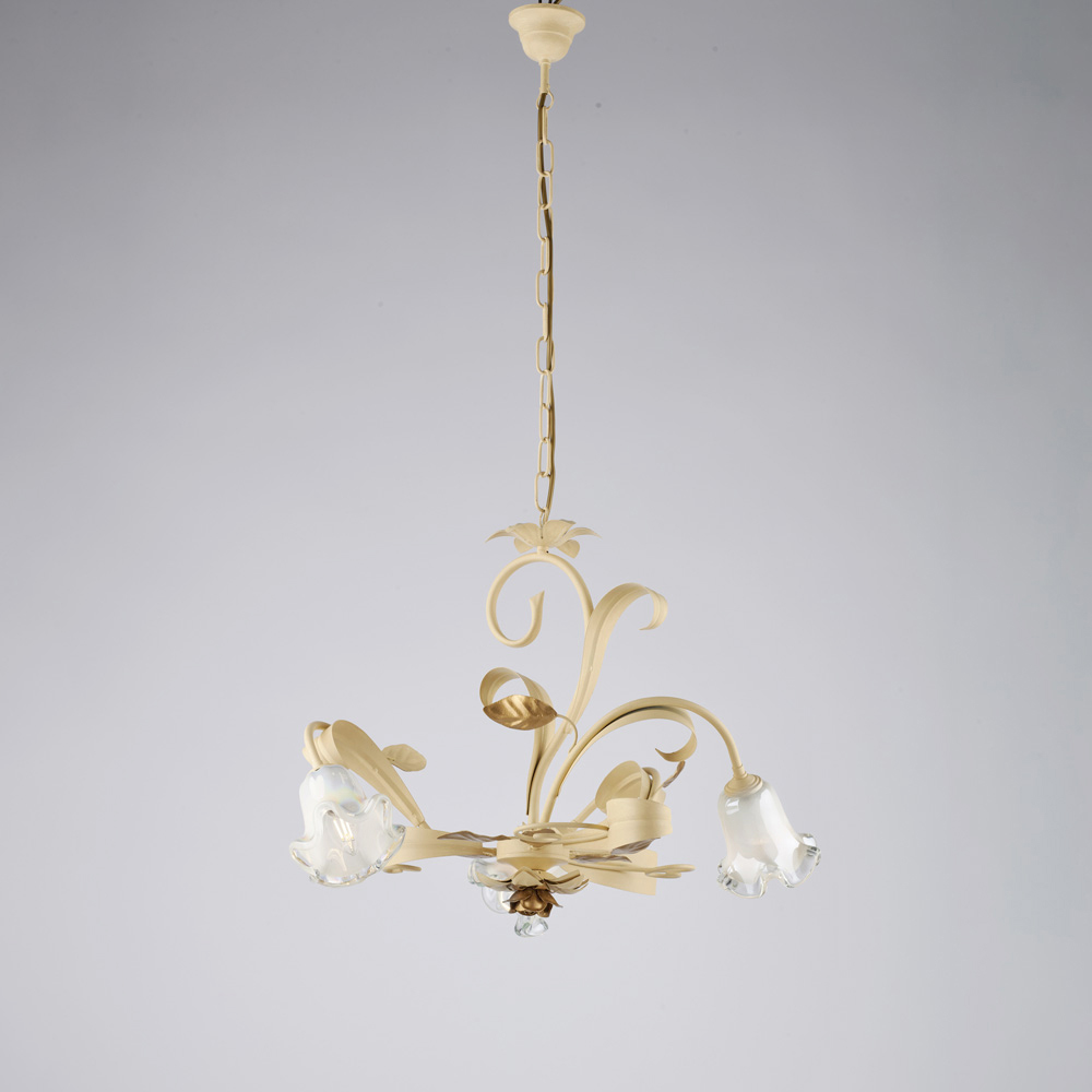 Romantisch und elegant zugleich: Dieser klassische Kronleuchter aus elfenbeinfarben lackiertem Eisen ist eine leuchtende Kreation, die den Charme italienischer Tradition auf raffinierte Weise neu interpretiert. Die geschwungene Form, verziert mit dekorativen Schnörkeln und einem blütenförmigen Glasschirm , verleiht dem Gesamtbild Leichtigkeit und Harmonie und schafft eine warme, einladende Atmosphäre.