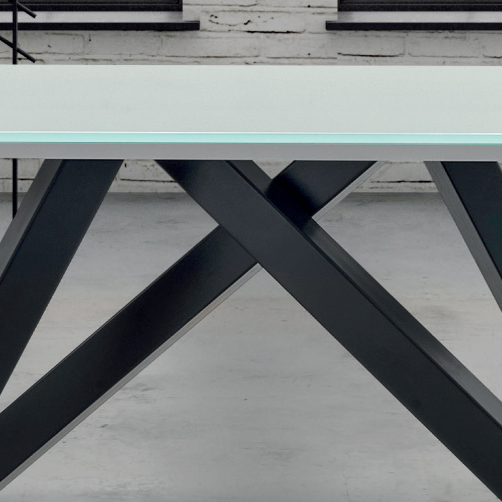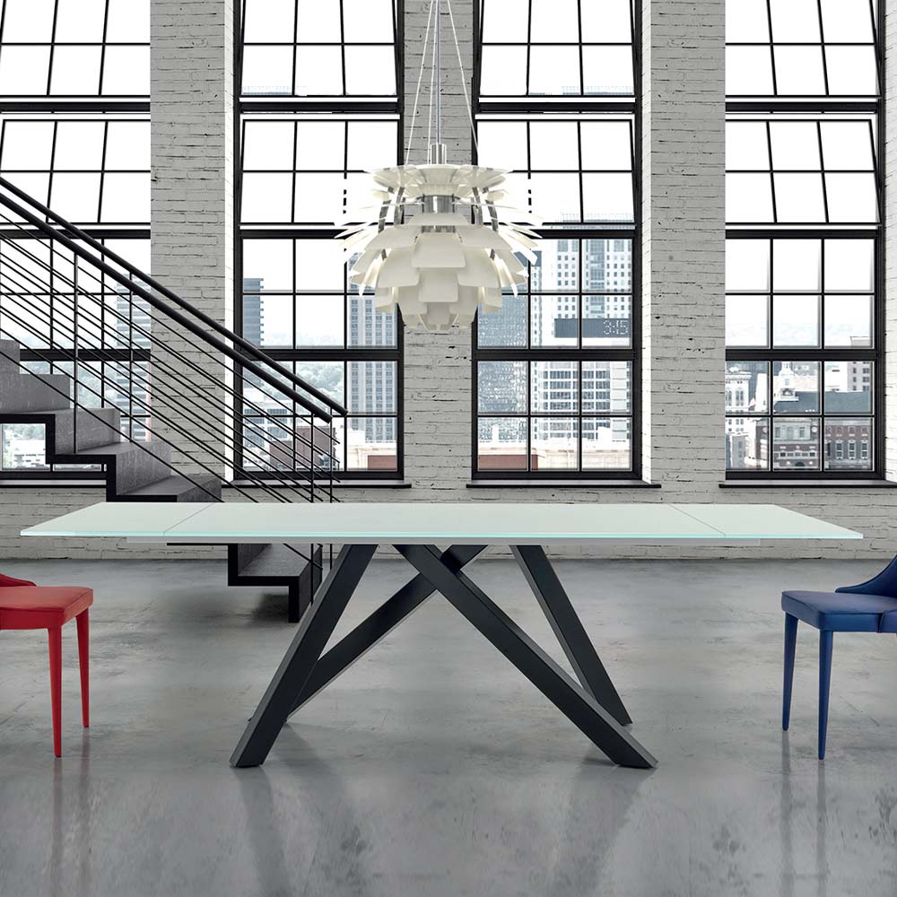 Ausziehbarer Küchentisch bis 278 cm mit Glasplatte und schwarzem Stahlgestell, hergestellt in Italien.