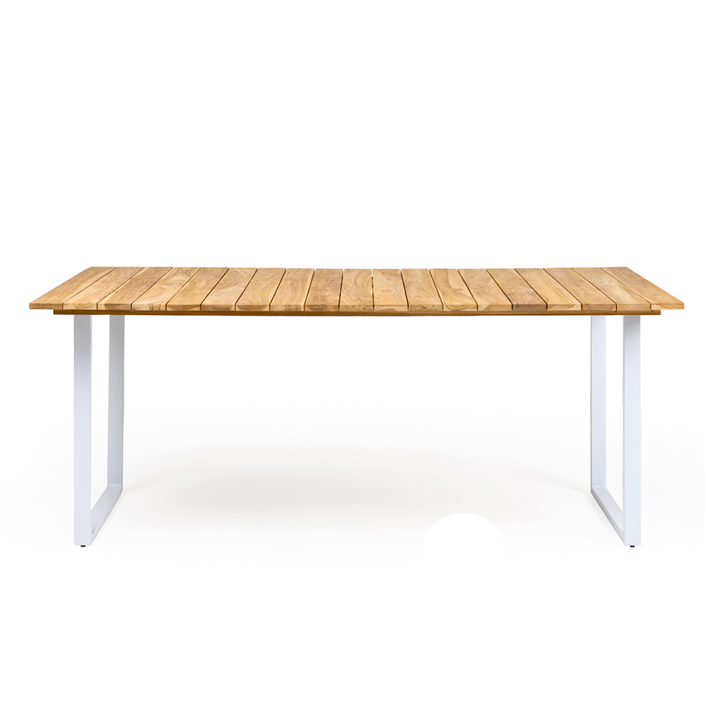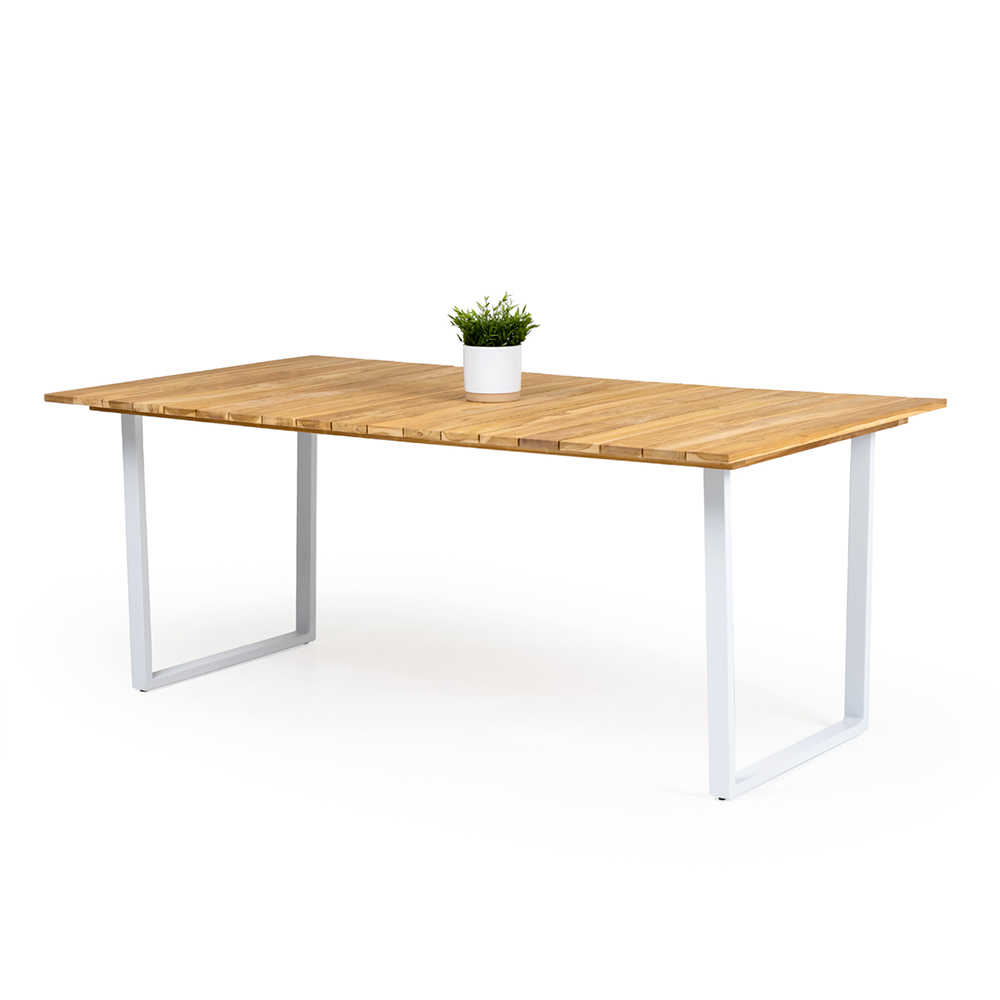 Gartentisch mit weiß lackiertem Aluminiumrahmen und einer Platte aus gebürstetem Naturteakholz.