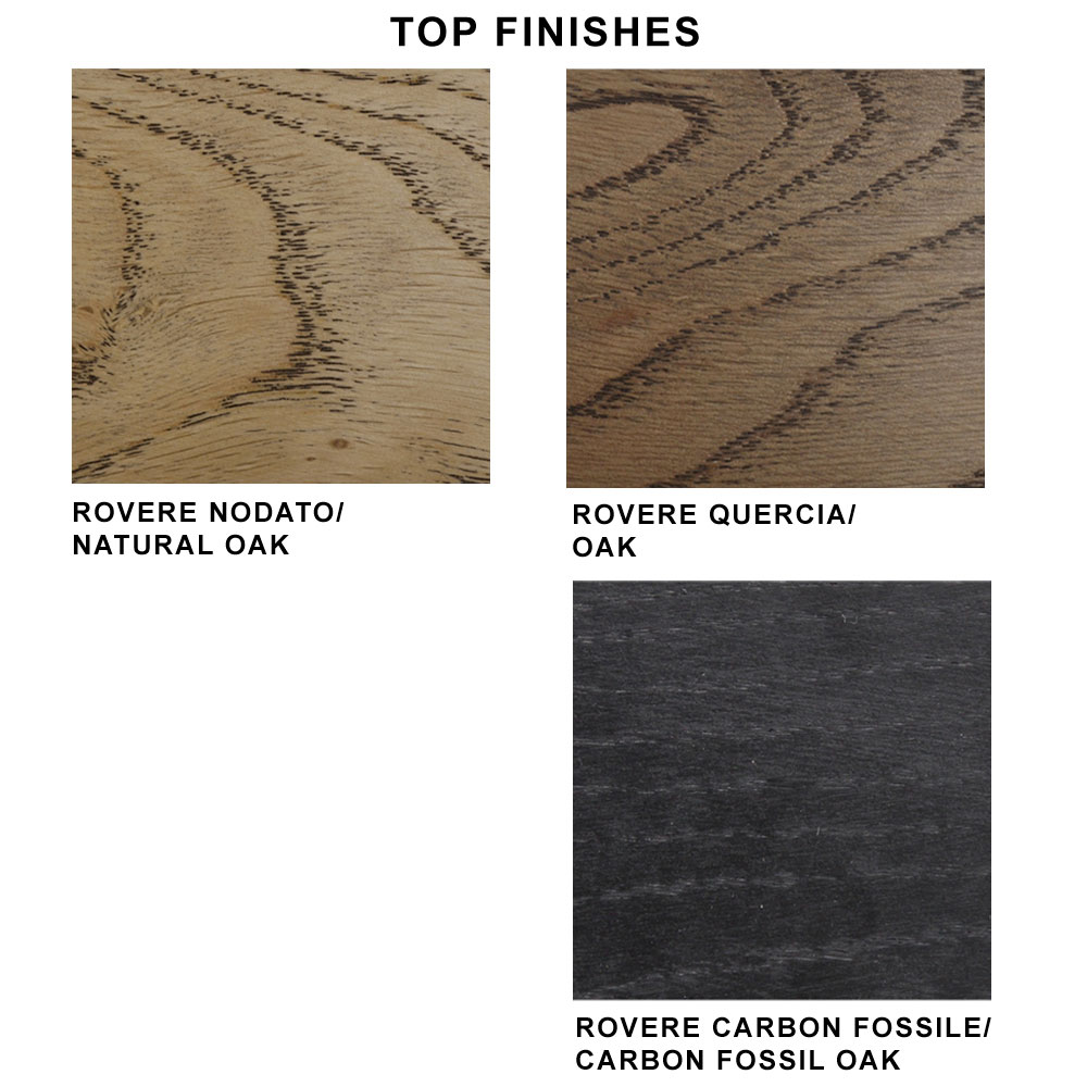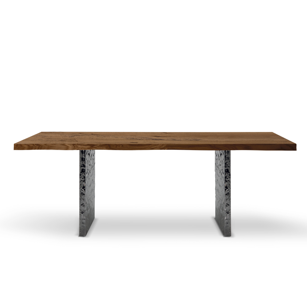 Design-Tisch mit furnierter Holzplatte und Gestell aus gehämmertem Stahl, handgefertigt in Italien.
