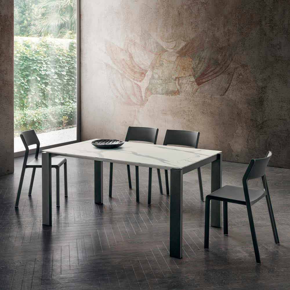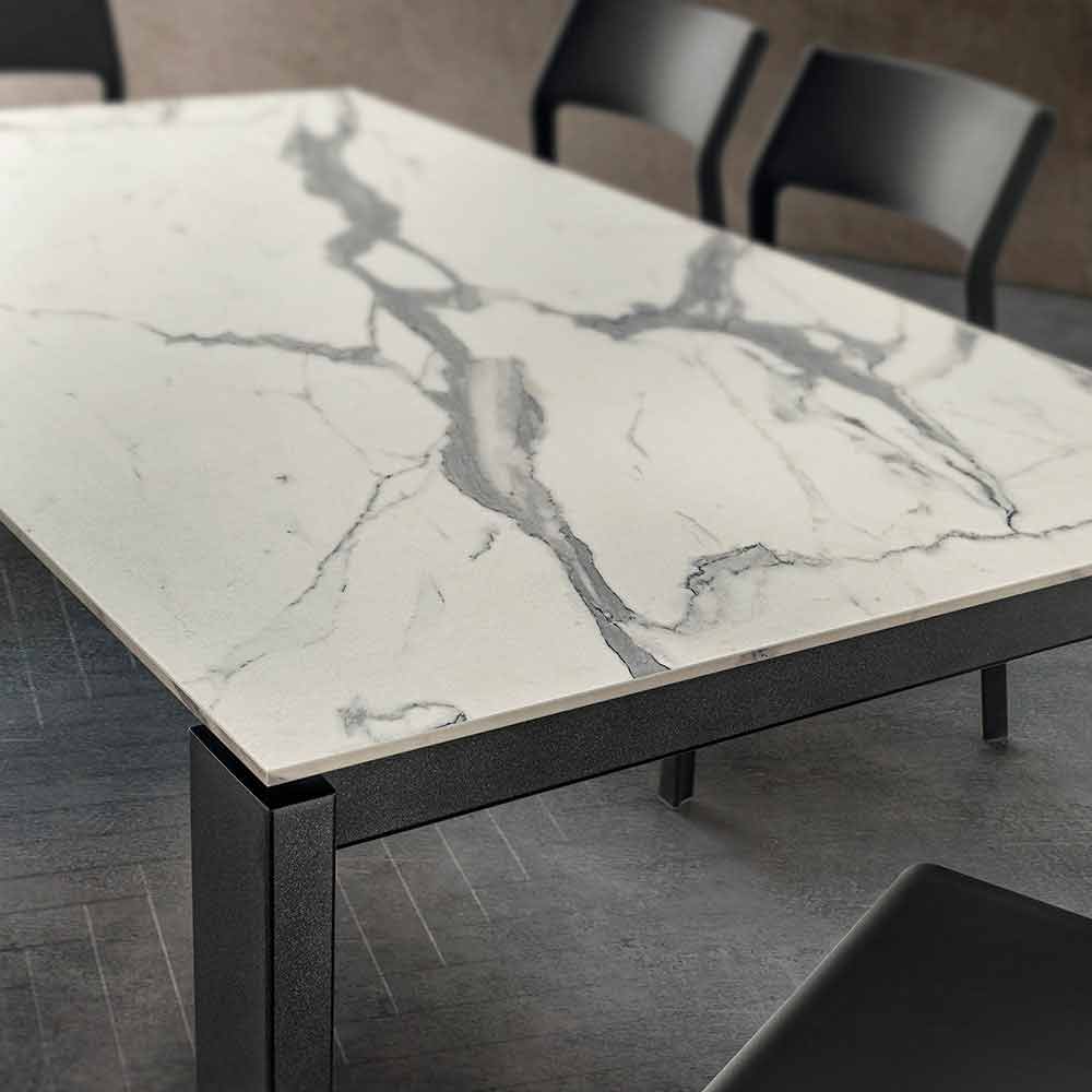 Esstisch zu 100 % Made in Italy mit HPL-Laminatplatte mit Marmoreffekt (Stärke 20 mm) und Metallstruktur mit Epoxidpulverlackierung in Anthrazit. Ein Möbelstück mit einer starken modernen Persönlichkeit , das sich durch ein einfaches und essentielles Design auszeichnet, das durch die wunderbaren vorgeschlagenen Oberflächen bereichert und einzigartig gemacht wird, die seine raffinierte Seele unterstreichen. Ideal für diejenigen, die einen vielseitigen Stil lieben, der im Raum nicht unbemerkt bleibt, bietet dieser Tisch eine unvergleichliche Qualität durch die Verwendung wertvoller Rohstoffe wie HPL, a Laminat bestehend aus dünnen Platten, die mit duroplastischen Harzen imprägniert und durch Hitze und Hochdruck zusammengepresst werden, wodurch ein qualitativ hochwertiges Ergebnis erzielt werden kann, das besonders widerstandsfähig gegen chemische Mittel, Abrieb und Kratzer ist .