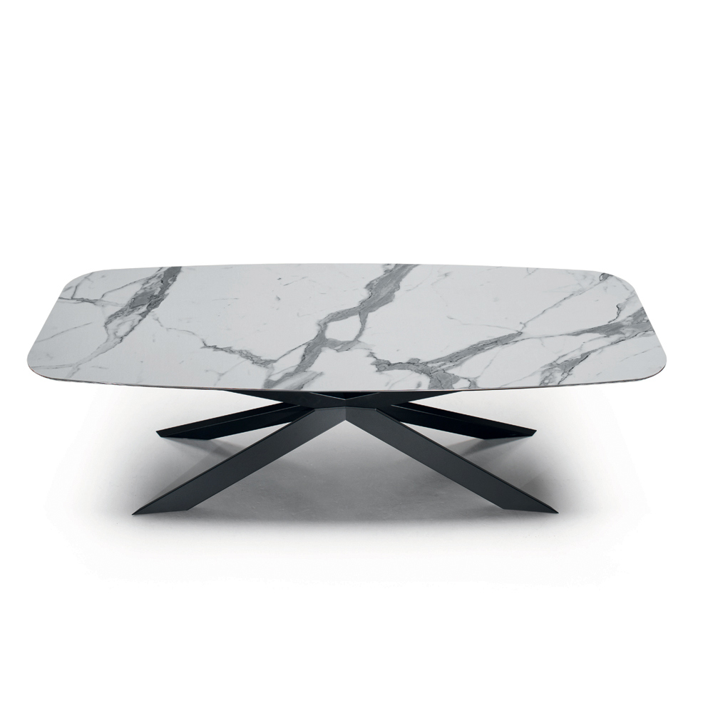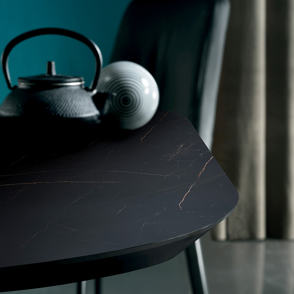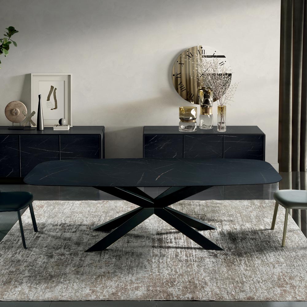 In Italien hergestellter Esstisch mit tonnenförmiger Platte aus HPL-Laminat mit Marmoreffekt (Stärke 38 mm) und schwarz lackiertem Stahlgestell . Ein exklusives Einrichtungsaccessoire, das sich durch eine starke moderne Persönlichkeit auszeichnet und sich ideal dazu eignet, jedes Esszimmer oder jede Küche mit einem zeitgemäßen, stilvollen Design zu vervollständigen. Die herrliche Kombination der ausgewählten Materialien und die besondere Tonnenform der Platte stellen die Schlüsselelemente dar, die die Ästhetik des Tisches bereichern und seine Qualität für ein raffiniertes und besonders widerstandsfähiges Ergebnis steigern. Um seinen Wert noch mehr zu unterstreichen, ist die HPL-Oberseite ein Hochdrucklaminat , das äußerst beständig gegen Chemikalien, Abrieb und Kratzer ist und es uns ermöglicht, eine solide Trägeroberfläche mit ausgezeichneter Haltbarkeit im Laufe der Zeit anzubieten.