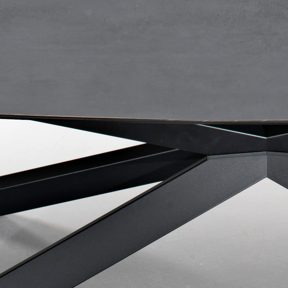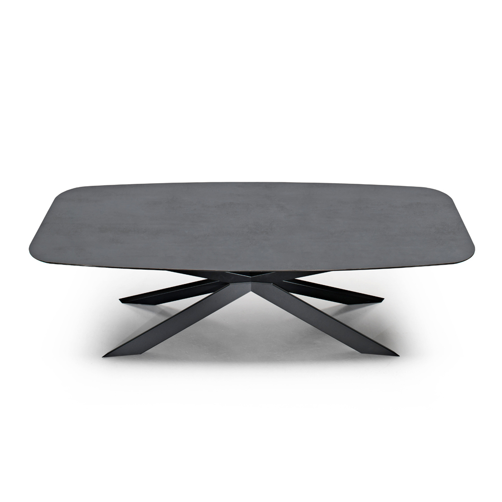 Esstisch mit tonnenförmiger Platte aus HPL-Laminat in Steinoptik, hergestellt in Italien.