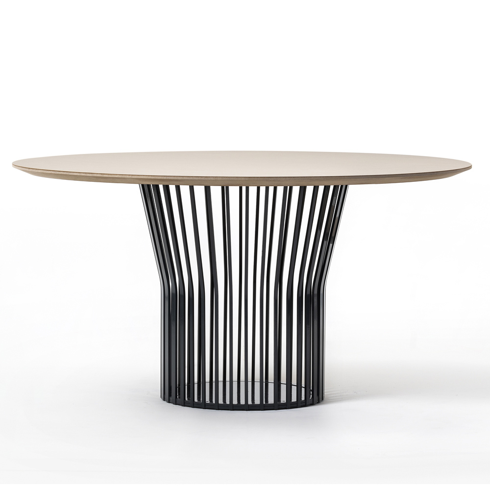 schwarz lackiertem Metallgestell . Letzteres stellt die wahre Stärke des Tisches dar, dank seines