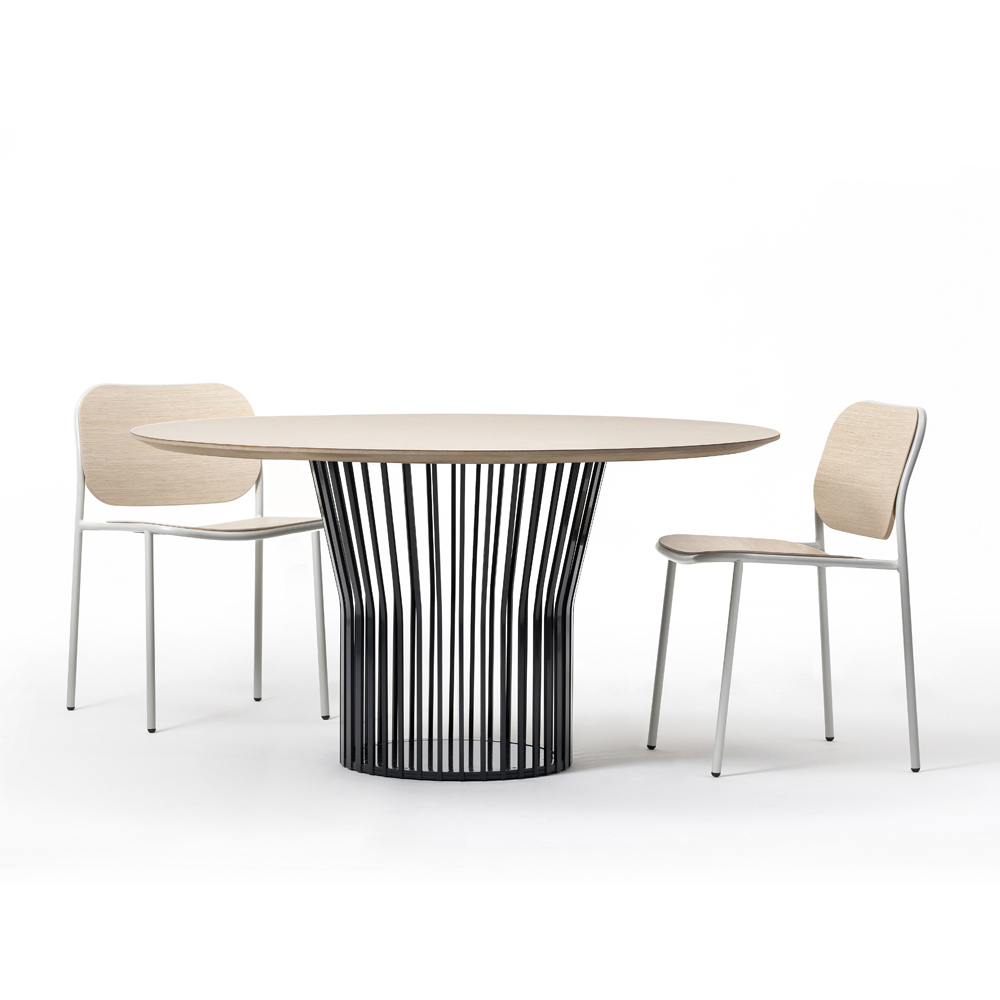 originellen und dynamischen Designs, das aus vielen Speichen unterschiedlicher Breite besteht, die sich oben nach außen falten und dann öffnen, um die Platte zu stützen. Das Ergebnis ist ein