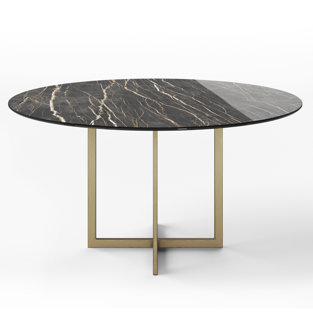 Esszimmertisch mit runder Platte aus Feinsteinzeug mit poliertem Marmoreffekt, getragen von einem lackierten Glas (8 mm dick) mit um 45 ° abgeschrägter Kante und Metallstruktur mit brünierter Messingoberfläche , vollständig in Italien hergestellt . Seine Ästhetik beruht auf Konzepten von Freiheit und Kreativität , da es die Möglichkeit bietet, aus einer breiten Palette verschiedener Oberflächen zu wählen, die die Umgebung mit Persönlichkeit und Raffinesse bereichern können. Design und Innovation zeichnen jedes Element dieses wunderbaren und eleganten Möbelstücks aus, das sich durch große Liebe zum Detail und die hohe Qualität der für seine Herstellung ausgewählten Materialien auszeichnet.