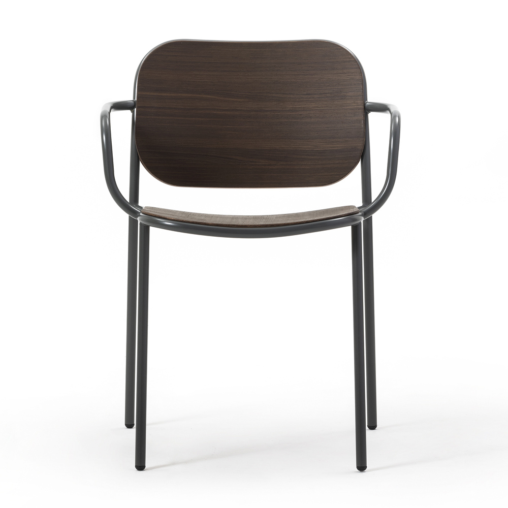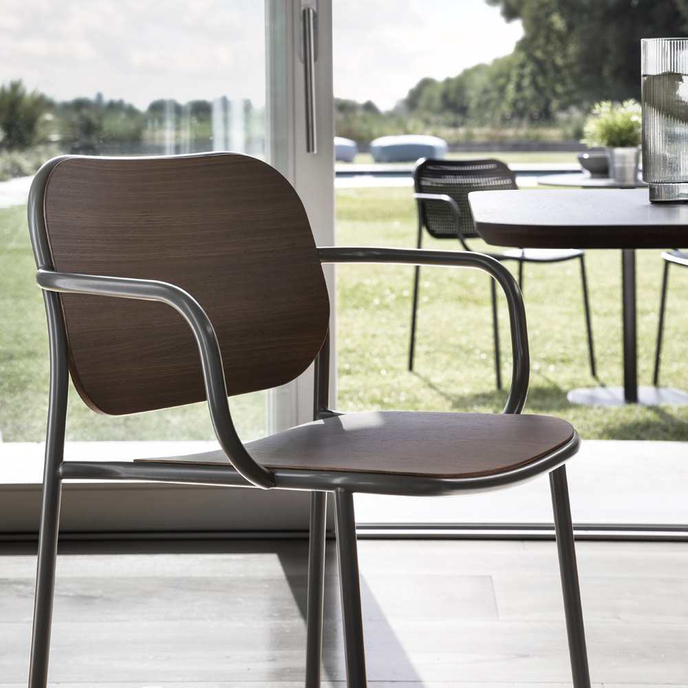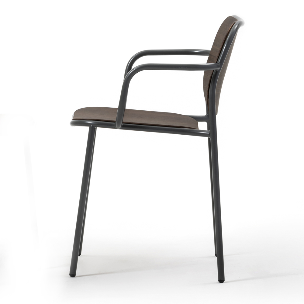 Stapelbarer Küchenstuhl, vollständig in Italien hergestellt, mit Gestell aus lackiertem Metall und Sitz und Rückenlehne aus Holz. Ein Design, das sich durch abgerundete und geschwungene Linien auszeichnet, die einen bequemen und einladenden Sitz bieten, auch dank der praktischen Armlehnen, die eine sehr bequeme Position ermöglichen. Dank seiner essentiellen Ästhetik vervollständigt es die Möbel, die es umgeben, inspiriert vom nordischen Stil der fünfziger Jahre und schafft gleichzeitig eine Vintage-Atmosphäre mit zeitlosem Geschmack. Die zeitgemäße Neuinterpretation eines traditionellen Designs bietet eine originelle und raffinierte Einrichtungslösung, die sich durch die perfekte Kombination von Materialien und Oberflächen für ein exklusives und avantgardistisches Ergebnis auszeichnet.