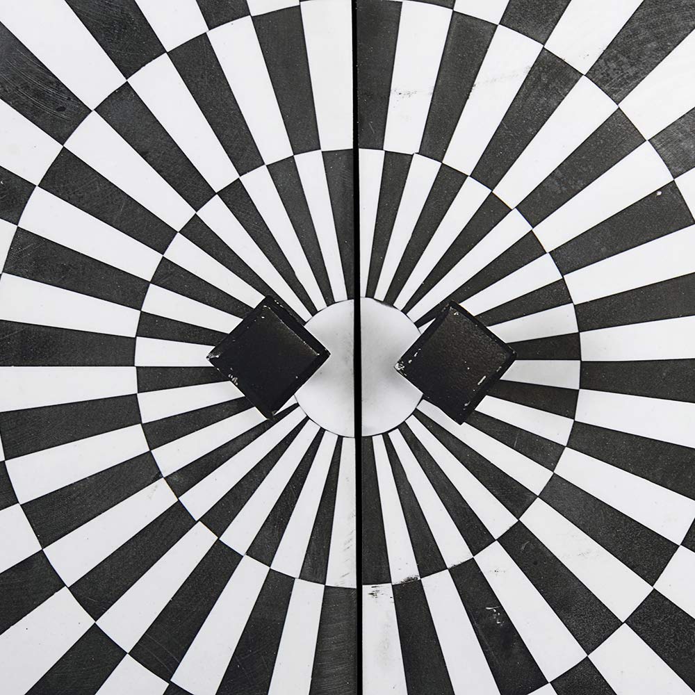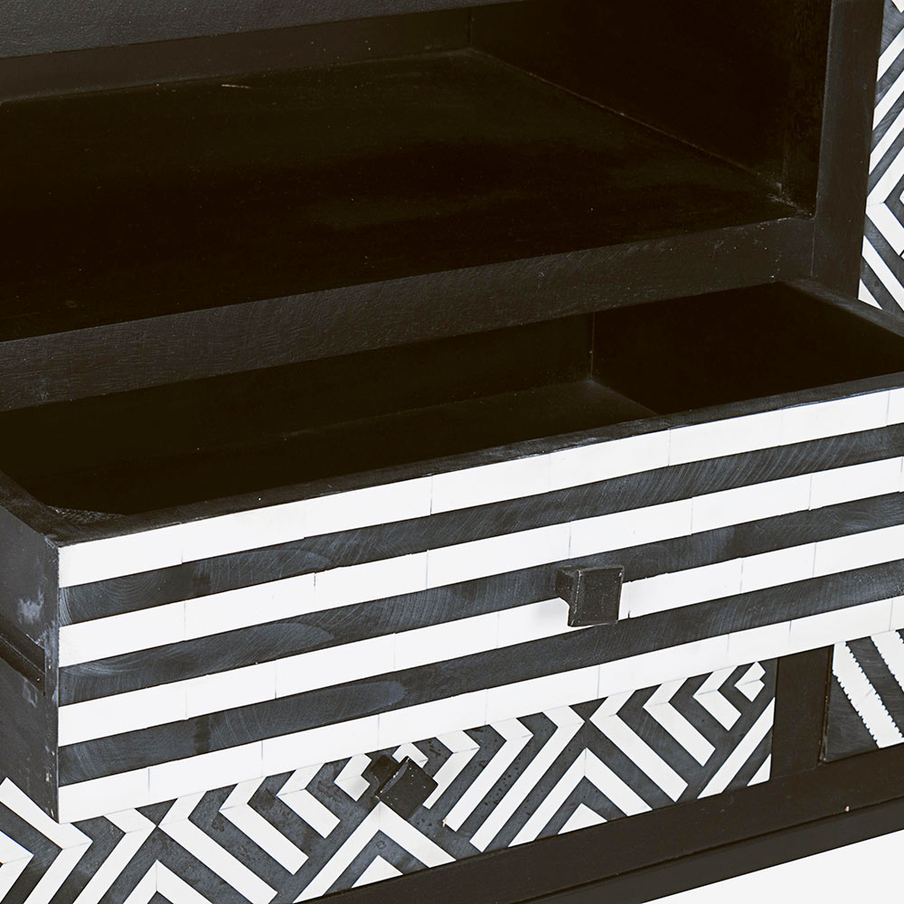 Die 4 Türen und 6 Schubladen werden in Mosaikverarbeitung durch die Verwendung von kleinen Harzblöcken mit einer Oberfläche auf Nitrozellulosebasis hergestellt.