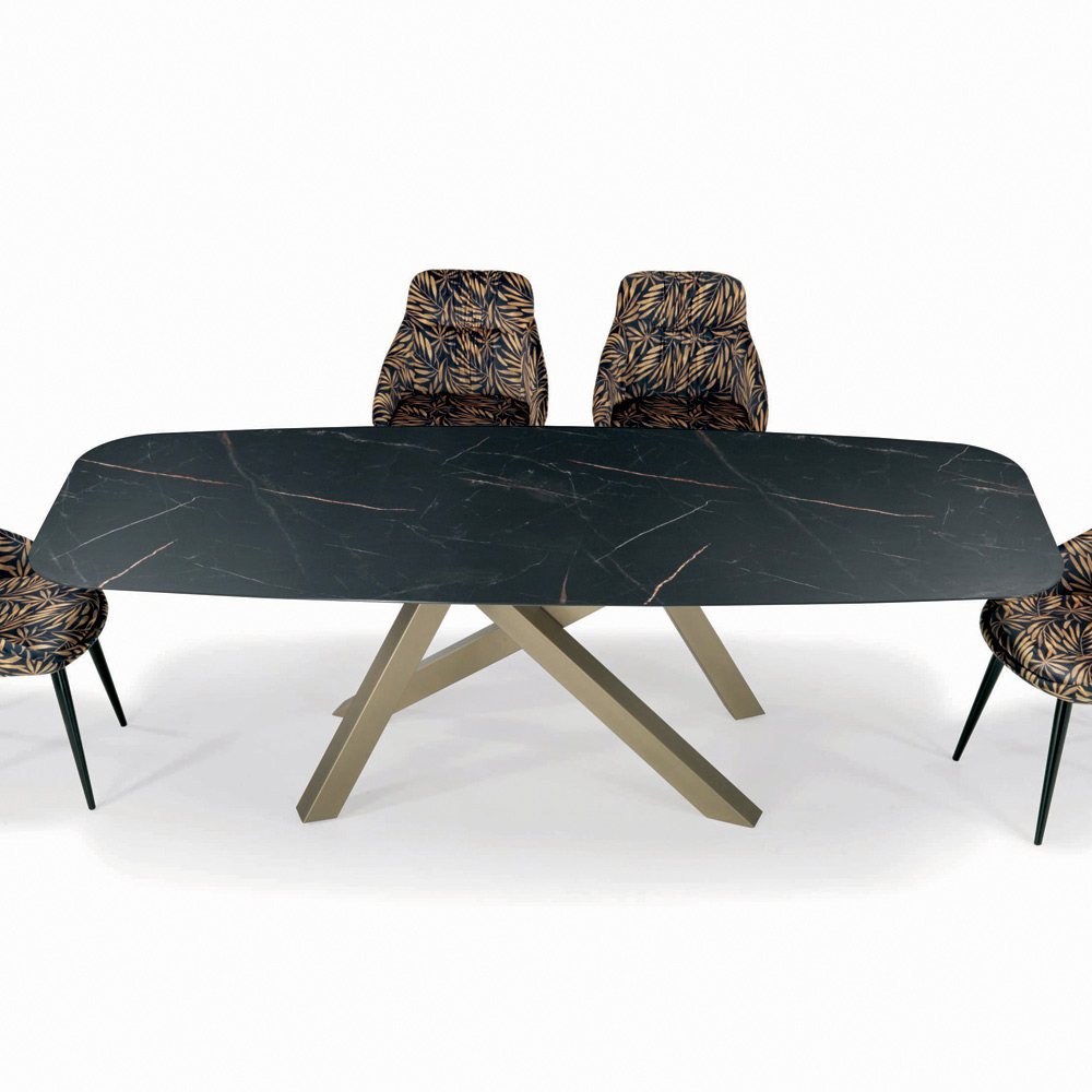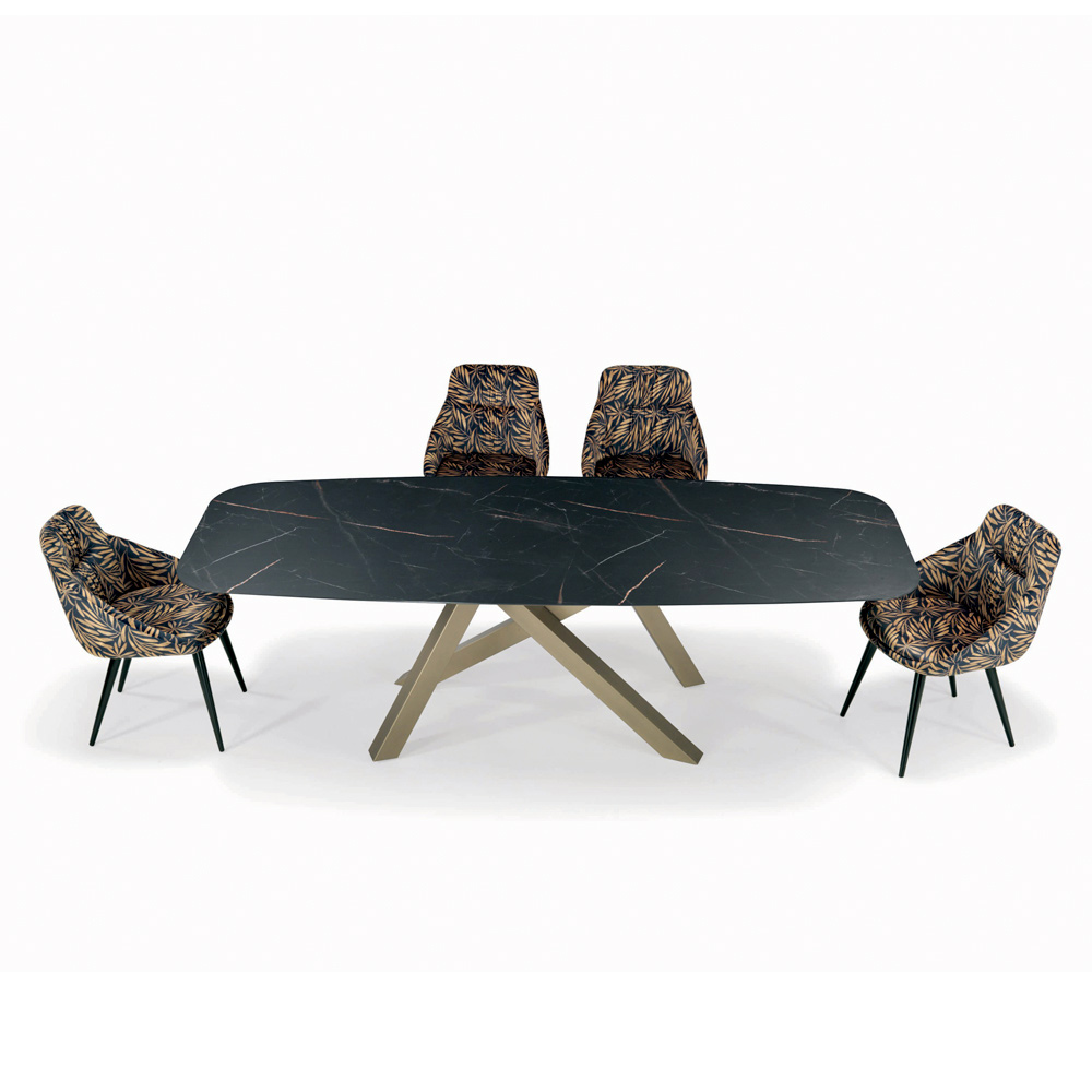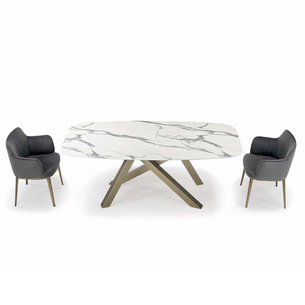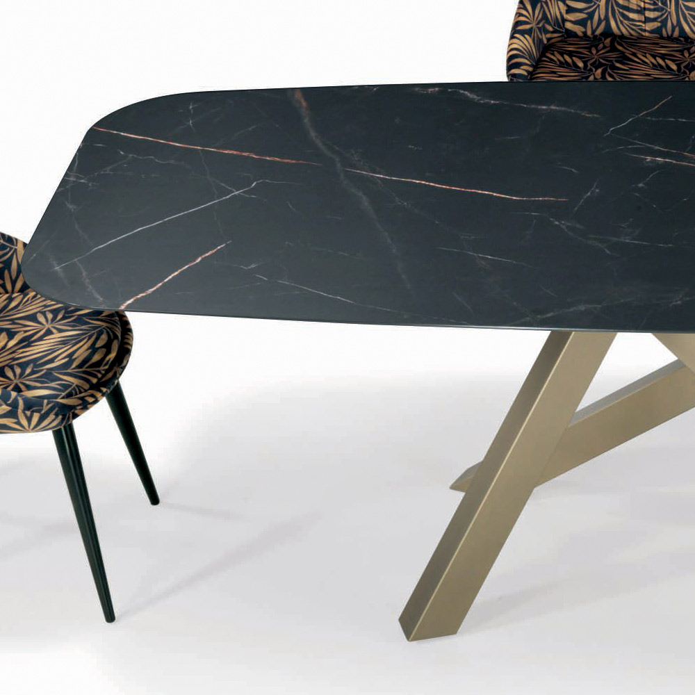 Fester Wohnzimmertisch mit tonnenförmiger Laminatplatte,30° abgeschrägter Kante, Untergestell aus champagnerfarben lackiertem Stahl mit verstellbaren Füßen. Moderner Stil und Eleganz vereinen sich in diesem Produkt, das jede Wohn- und Objektumgebung vervollständigt und einzigartig macht. Dank der ausgewählten Oberflächen und Materialien ist die Qualität des Made in Italy garantiert und ein Produkt, das nicht nur schön, sondern auch funktional und praktisch ist.