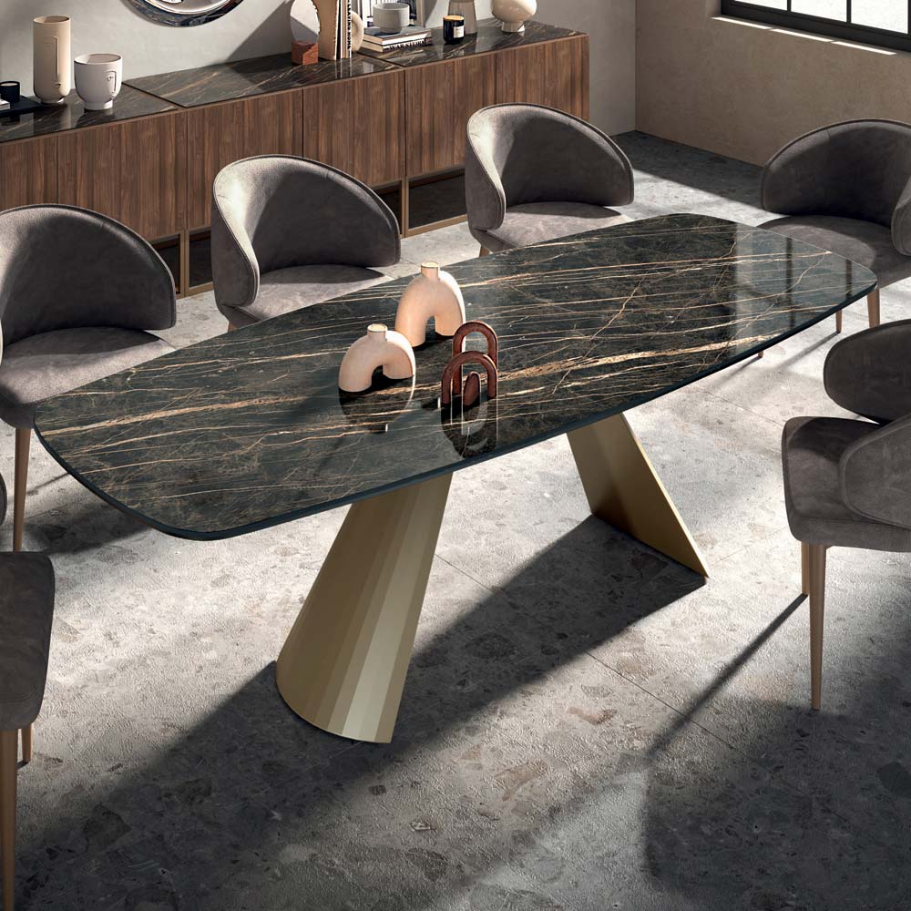 Fester, tonnenförmiger Wohnzimmertisch mit Keramikplatte , 45° abgeschrägter Kante , Sockel aus champagnerfarben lackiertem Stahl und verstellbaren Füßen. Die Auswahl hochwertiger Materialien und die Liebe zur Gestaltung jedes einzelnen Details schaffen ein Produkt von ausgezeichneter Qualität „Made in Italy“ . Dank der Form des Gestells und der verfügbaren Ausführungen ist dieser Tisch der Protagonist jeder alltäglichen Objektumgebung und eine perfekte Idee für alle, die dem Raum eine elegante, prächtige und einzigartige Note verleihen möchten.