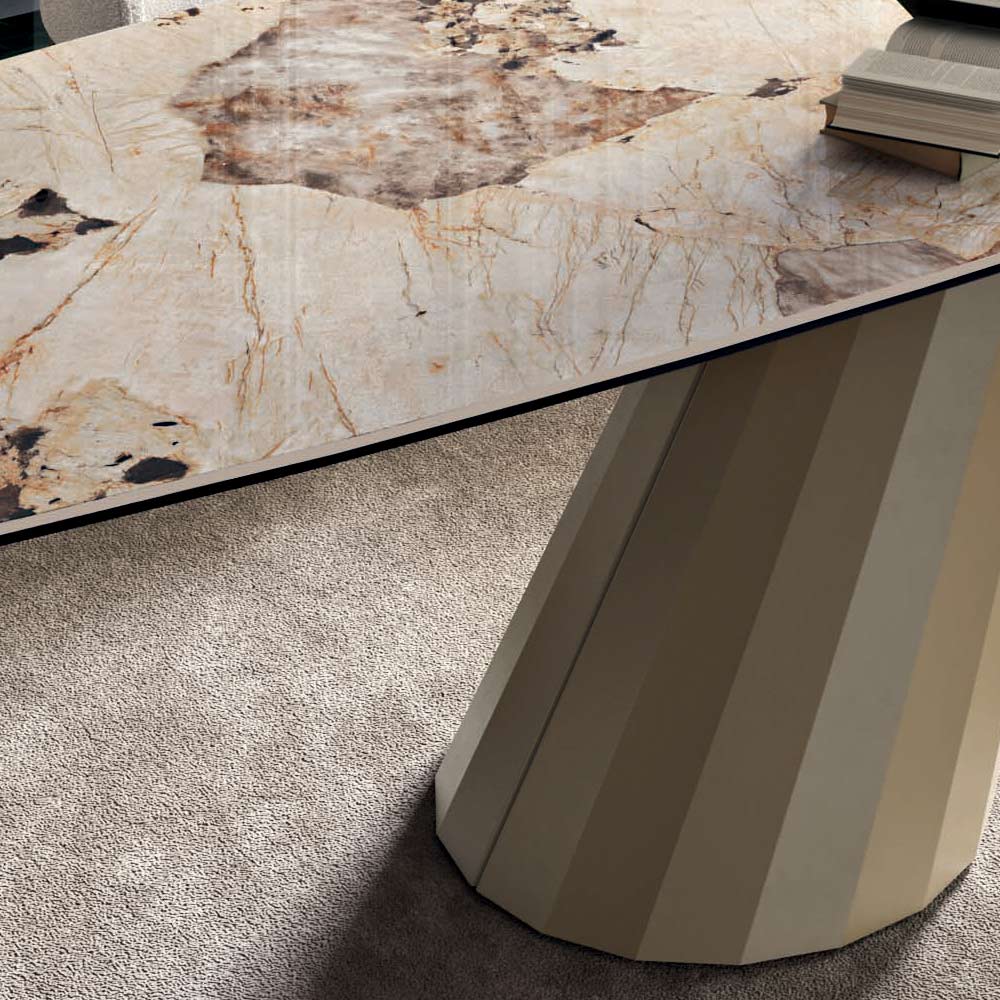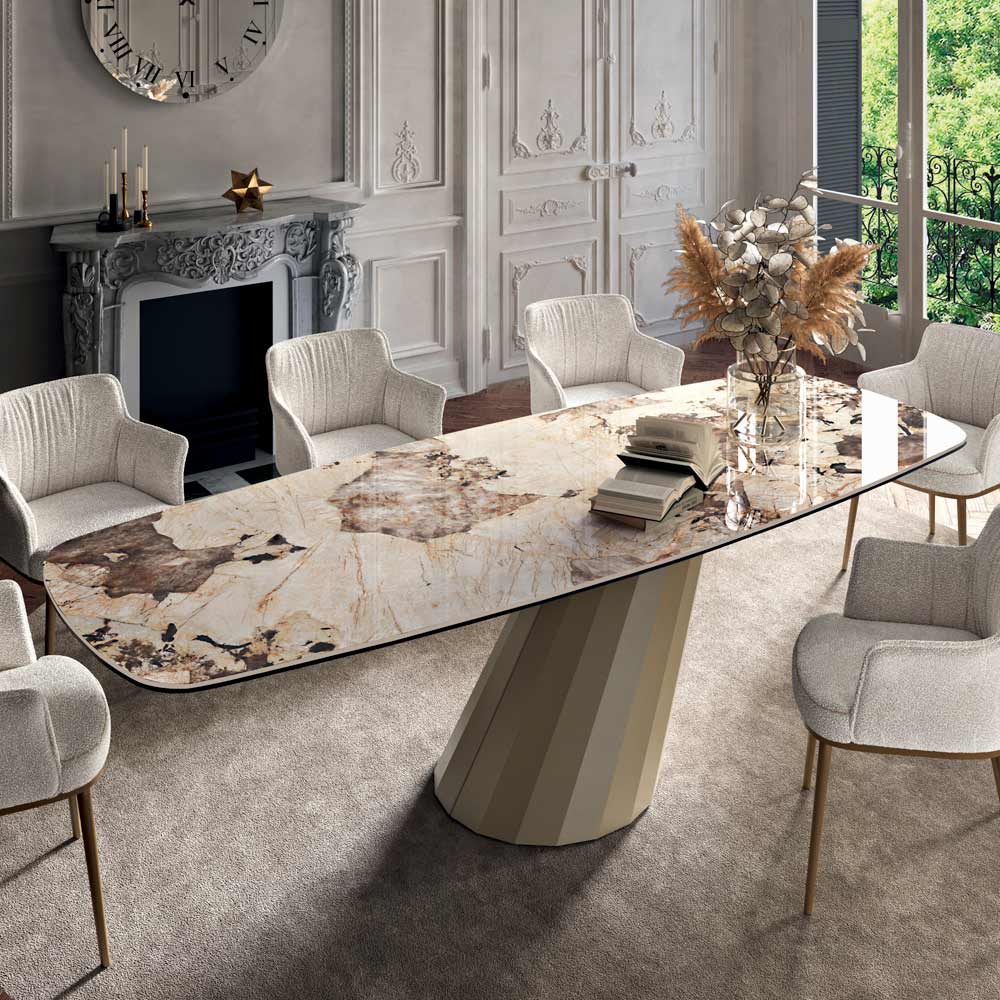 Fester, tonnenförmiger Wohnzimmertisch mit Keramikplatte , 45° abgeschrägter Kante , Sockel aus champagnerfarben lackiertem Stahl und verstellbaren Füßen, hergestellt in Italien. Dieses Produkt strahlt große Eleganz aus und wird zum Protagonisten jeder Umgebung . Durch die Verfeinerung der Form des Untergestells in Kombination mit der von Ihnen gewählten Oberfläche der Tischplatte entsteht ein einzigartiger Tisch mit großer optischer Wirkung, der Alltags- und Objektumgebungen mit Geschmack und Raffinesse einrichtet. Die Auswahl hochwertiger Materialien und die Liebe zur Gestaltung jedes einzelnen Details schaffen ein Produkt von ausgezeichneter Qualität „Made in Italy“.