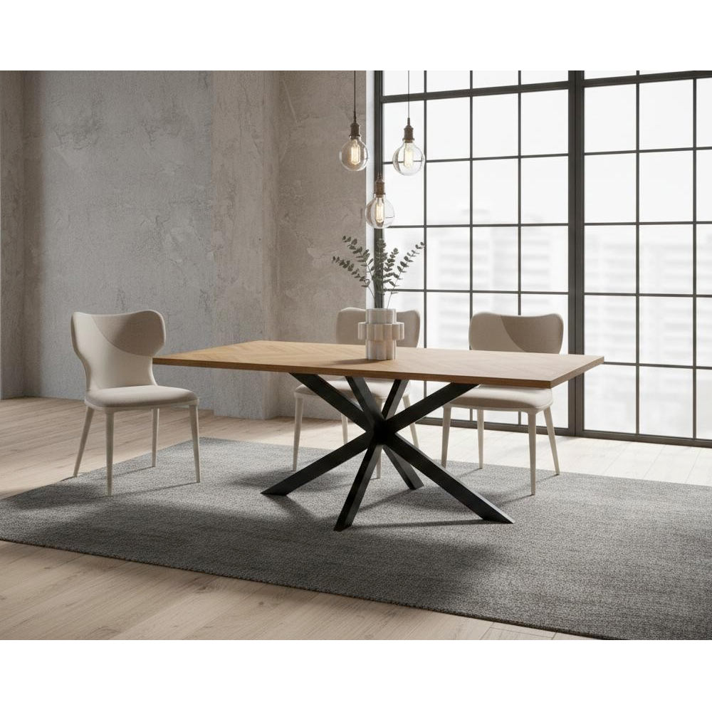 Dieser Tisch vereint auf perfekte Weise natürliche Wärme und modernes Design . Die Eichenplatte wertet den Raum mit ihrer natürlichen Maserung und edlen Ästhetik auf und macht jedes Stück zu einem Unikat, das dem Essbereich oder Wohnzimmer Charakter verleiht.