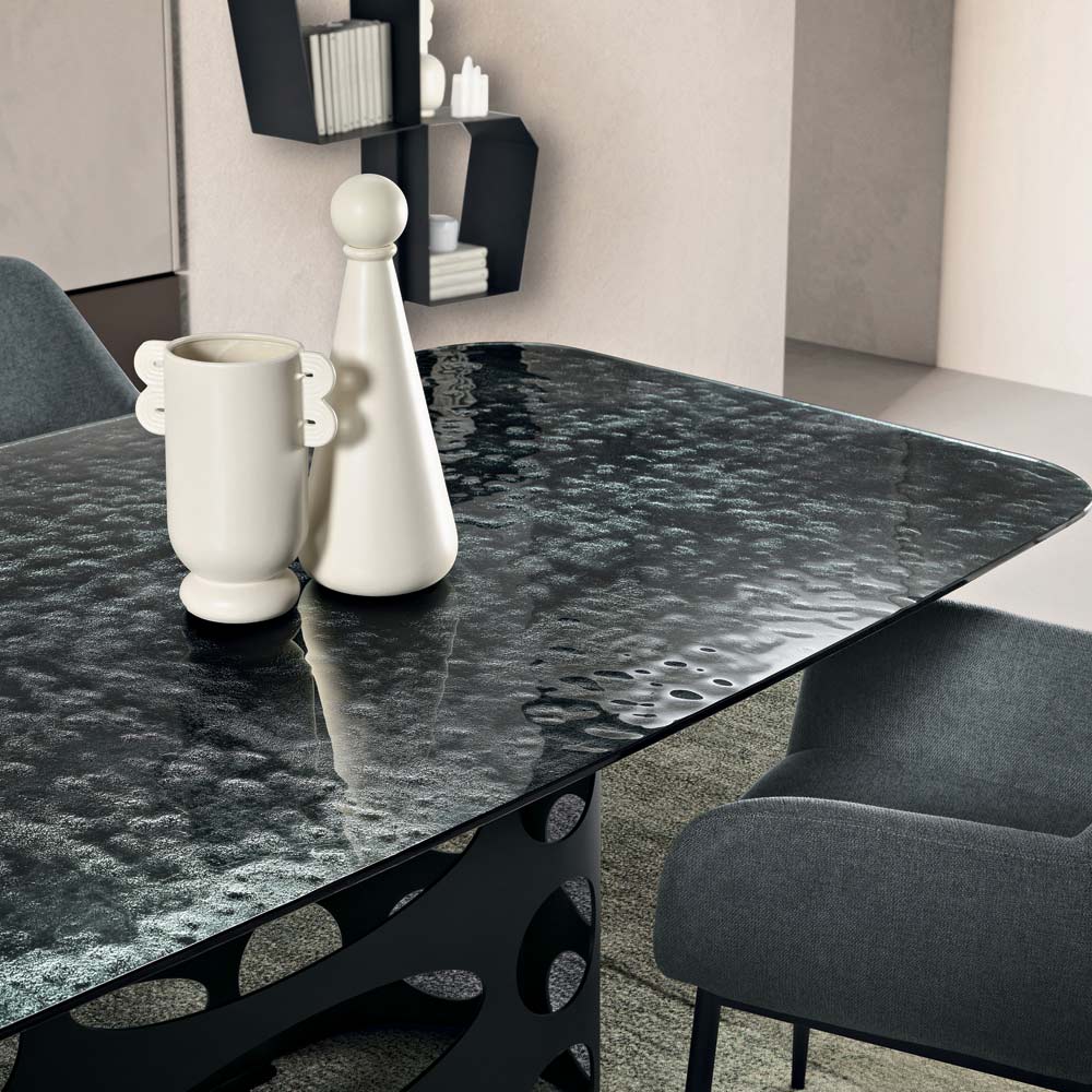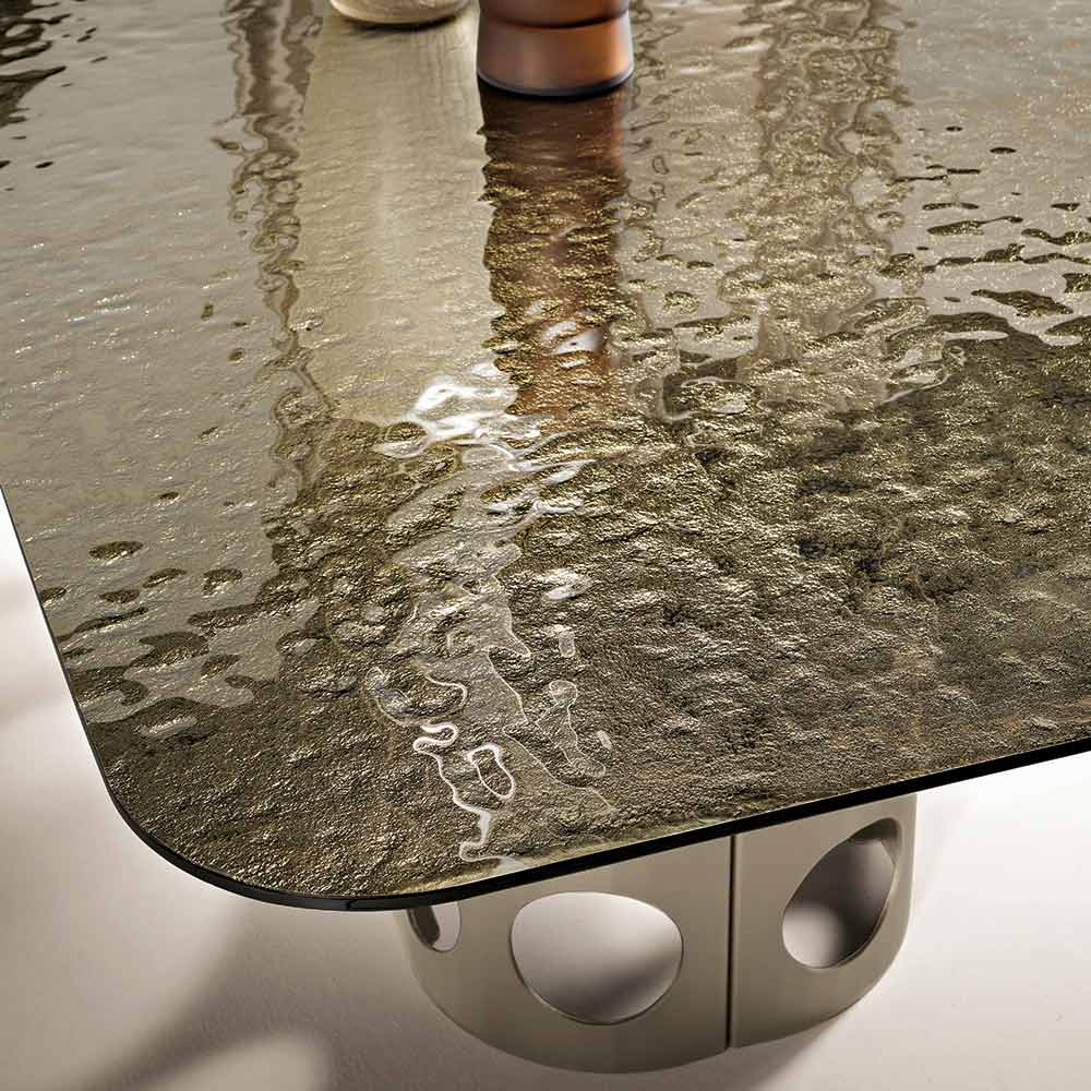 Die gehämmert Glasplatte verleiht dem Tisch Tiefe und Charakter. Ihre einzigartige, strukturierte Oberfläche reflektiert das Licht in einem unregelmäßigen Muster und erzeugt so faszinierende visuelle Effekte. Durch dieses Verfahren wirkt jede Oberfläche dynamisch und edel und unterstreicht das moderne Design des Produkts.