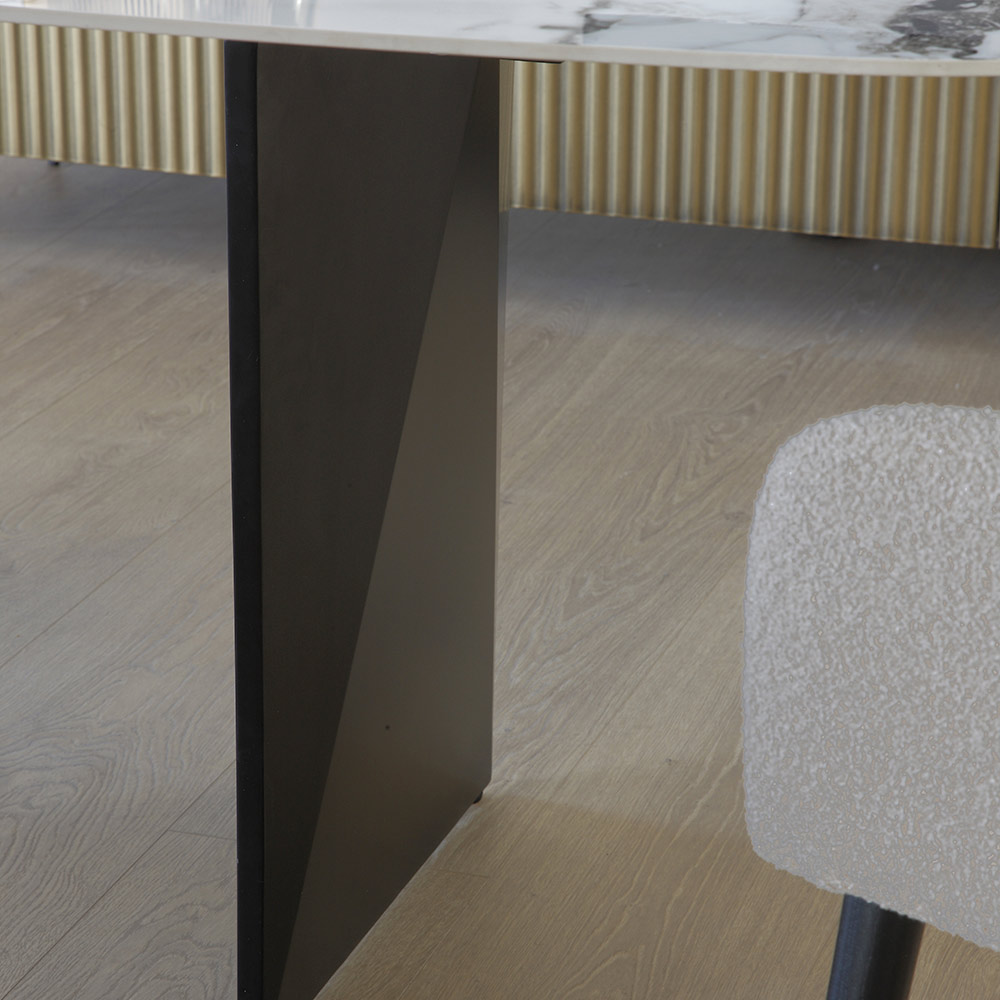 Der lackierte Metallsockel besticht durch ein minimalistisches, aber eindrucksvolles geometrisches Design mit blattförmigen Beinen , die Stabilität und optische Leichtigkeit garantieren. Dieser Kontrast zwischen der Solidität der Struktur und der Eleganz der Tischplatte erzeugt einen harmonischen und modernen Effekt.