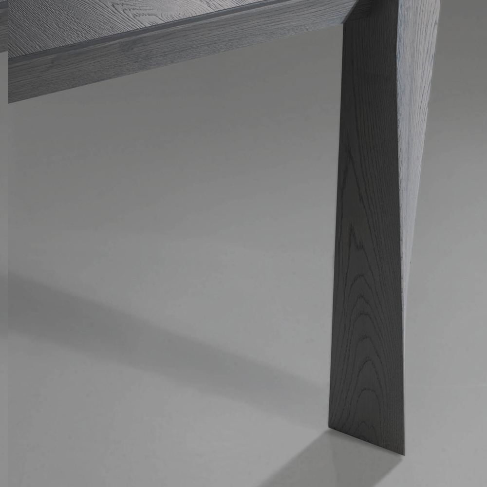 Fester Tischmit abgeschrägter Tischplatte aus grauem Eichenfurnier undspiralförmigen Lamellenbeinen . Maße H 77 cm, Dicke 2 cm.