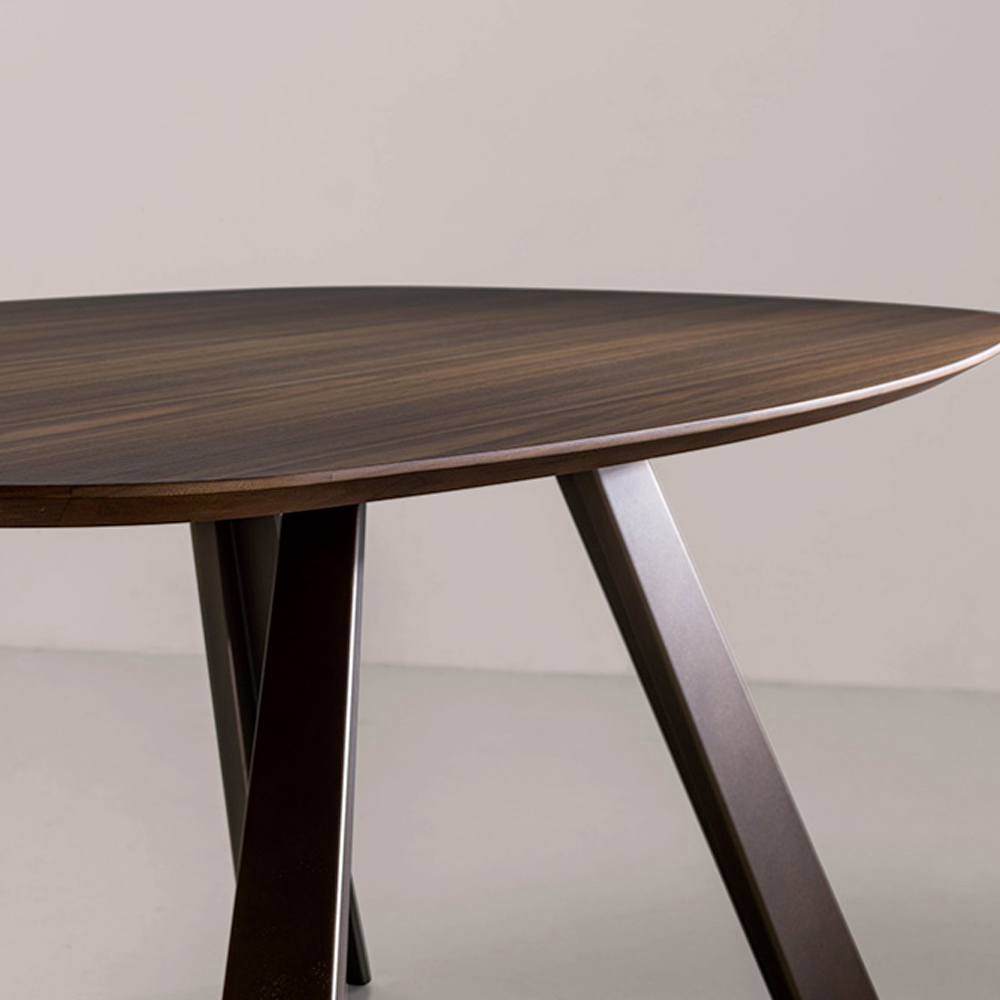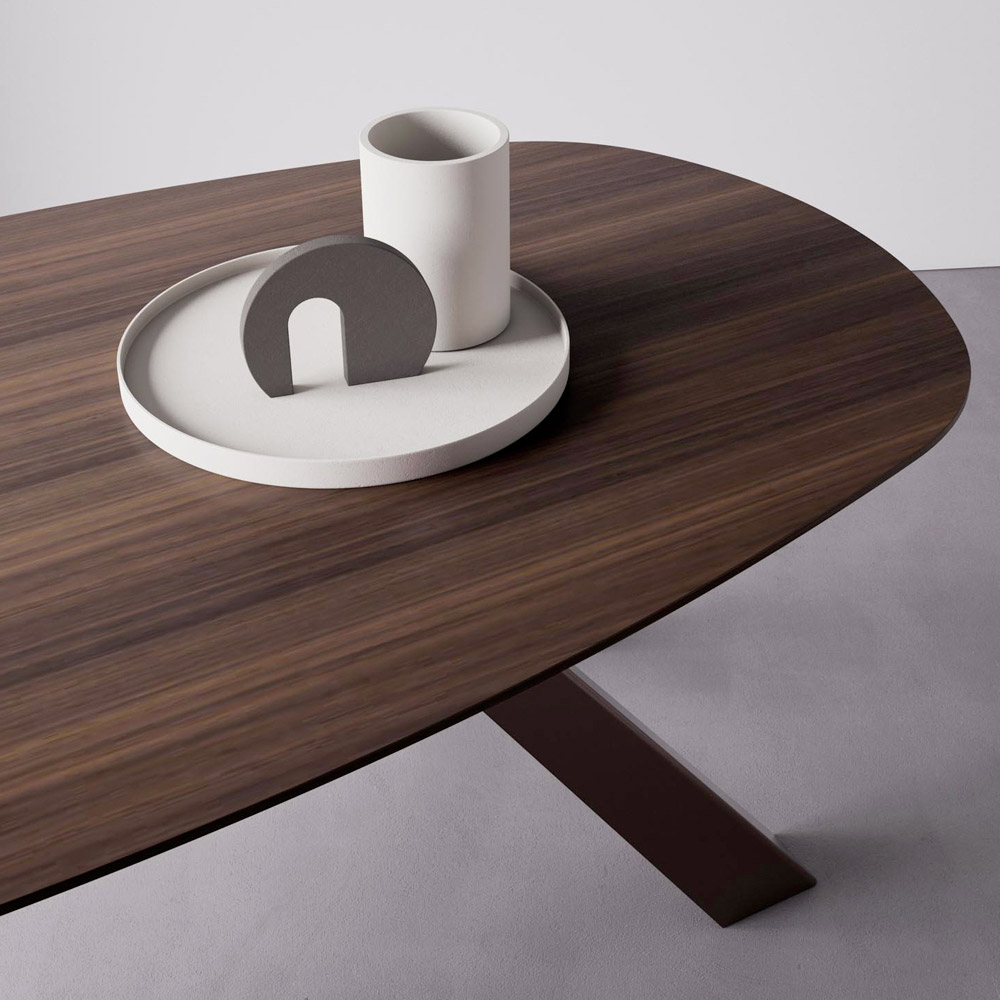 Fester Tisch mit elliptisch abgeschrägter Platte aus eukalyptusfurnierter Tischlerplatte und Beinen aus lackiertem Metall mit Bronze-Finish.AbgeschrägteOberkante. Abmessungen H 77 cm, Dicke 3 cm.