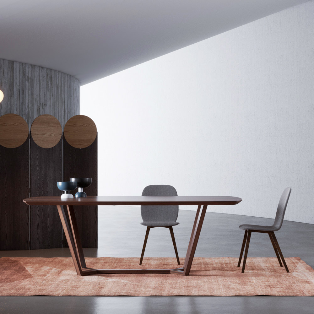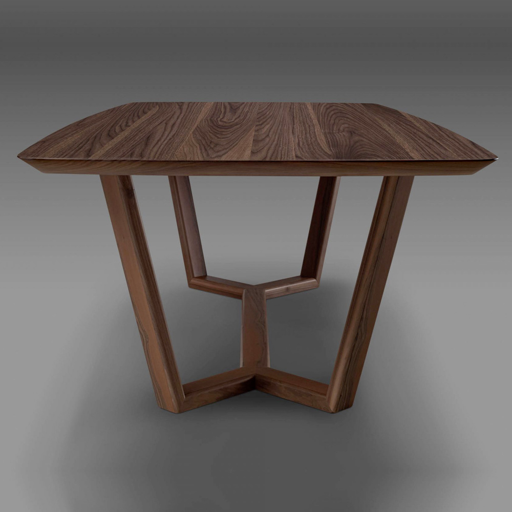 Fester Tisch mit geformter und abgeschrägter Platte auf Tischlerplatte aus Canaletto-Walnussfurnier und Untergestell aus Massivholz.