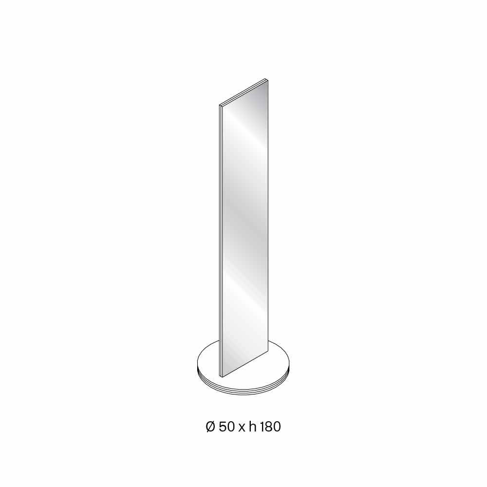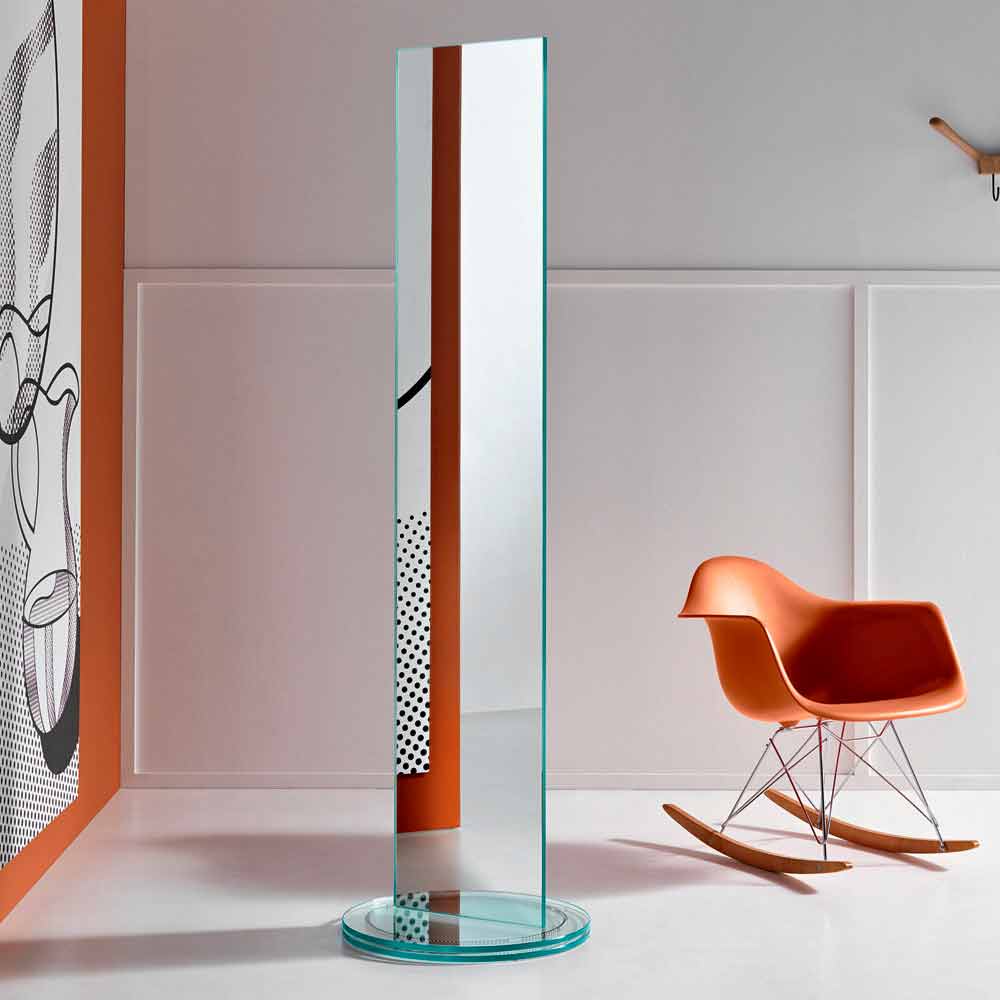 Dieser freistehende Spiegel zeichnet sich durch sein skulpturales Design aus, das vollständig aus doppelseitigem Spiegel mit drehbarem Fuß aus gehärtetem Glas besteht.