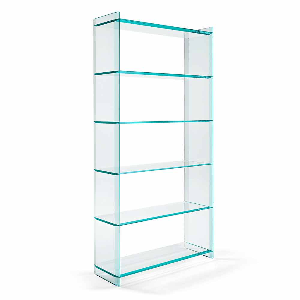 Dieses Wohnzimmer Bücherregal zeichnet sich durch sein faszinierendes und elegantes Design aus, das vollständig aus extra klarem Glas mit 5 cm Fase besteht.