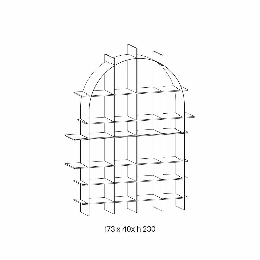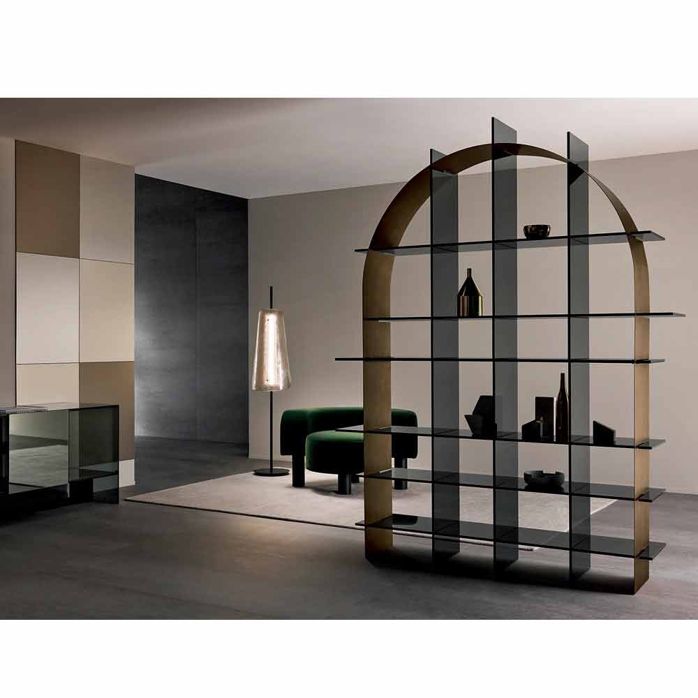 Seine Besonderheit besteht in der ineinandergreifenden Struktur aus bogenförmigem Feinblech in gebürsteter Bronze, die sich in die Komposition einfügt und einen Effekt von extremer Raffinesse und Geometrie verleiht.