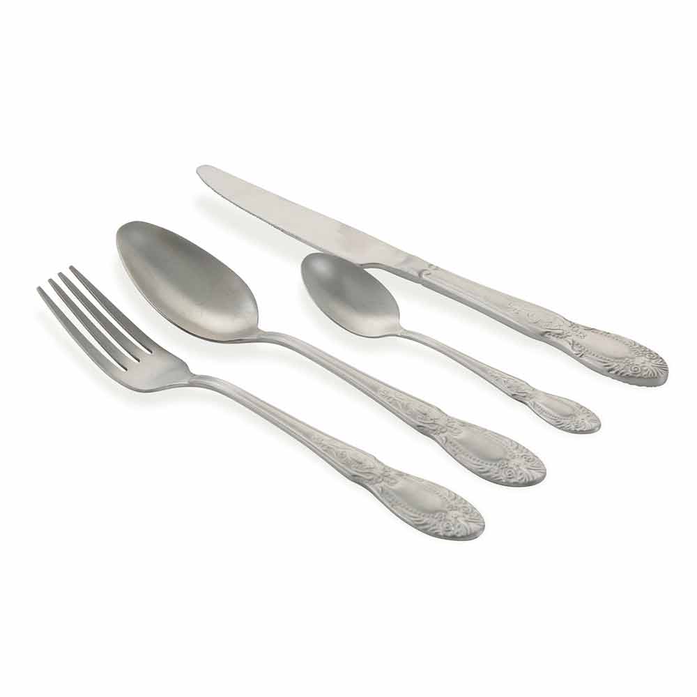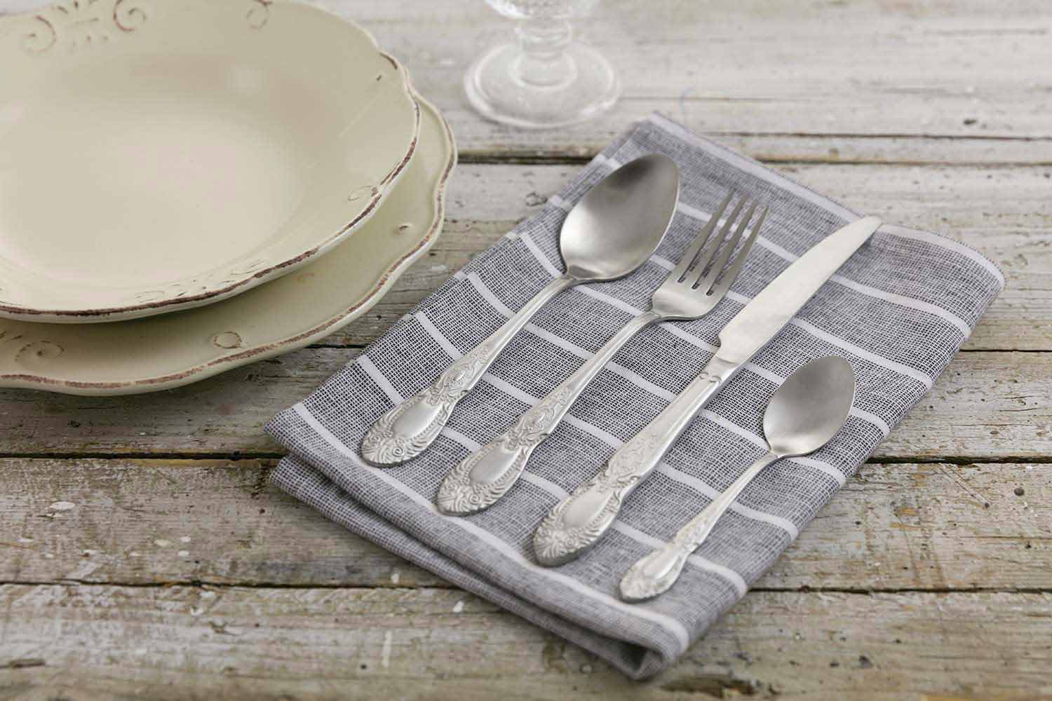 | Maße | Messer: l. 2 x p. 0,3 x h. 20,5 cm Löffel: l. 4 x p. 0,3 x h. 20,5 cm Gabel: l. 2,5 x p. 0,3 x h. 21 cm Teelöffel: l. 2,7 x p. 0,3 x h. 13,5 cm |