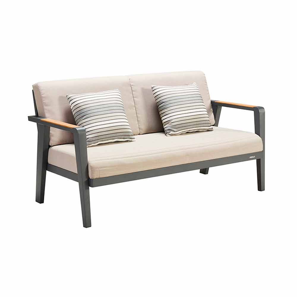 Der Außenraum ist gekennzeichnet durch die Struktur des Anthrazitgrau pulverbeschichtetem Aluminium gefertigt. Das Sofa und die Sessel mit Armlehnen mitTeakholzoberfläche haben einen Sitz aus hellgrauem Olefin-Textilfasergewebe mit dekorativen Kissen. Die Oberseite des rechteckigen Couchtischs aus Teakholz kommuniziert mit dem Rest des Zubehörs und ist praktisch und funktional.