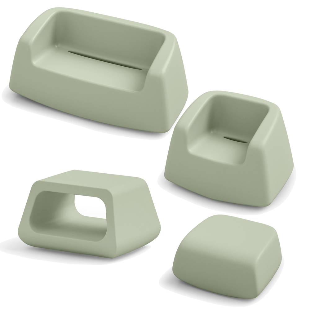 Die Komposition umfasst einen Sessel, ein Sofa, einen Couchtisch und einen Pouf.