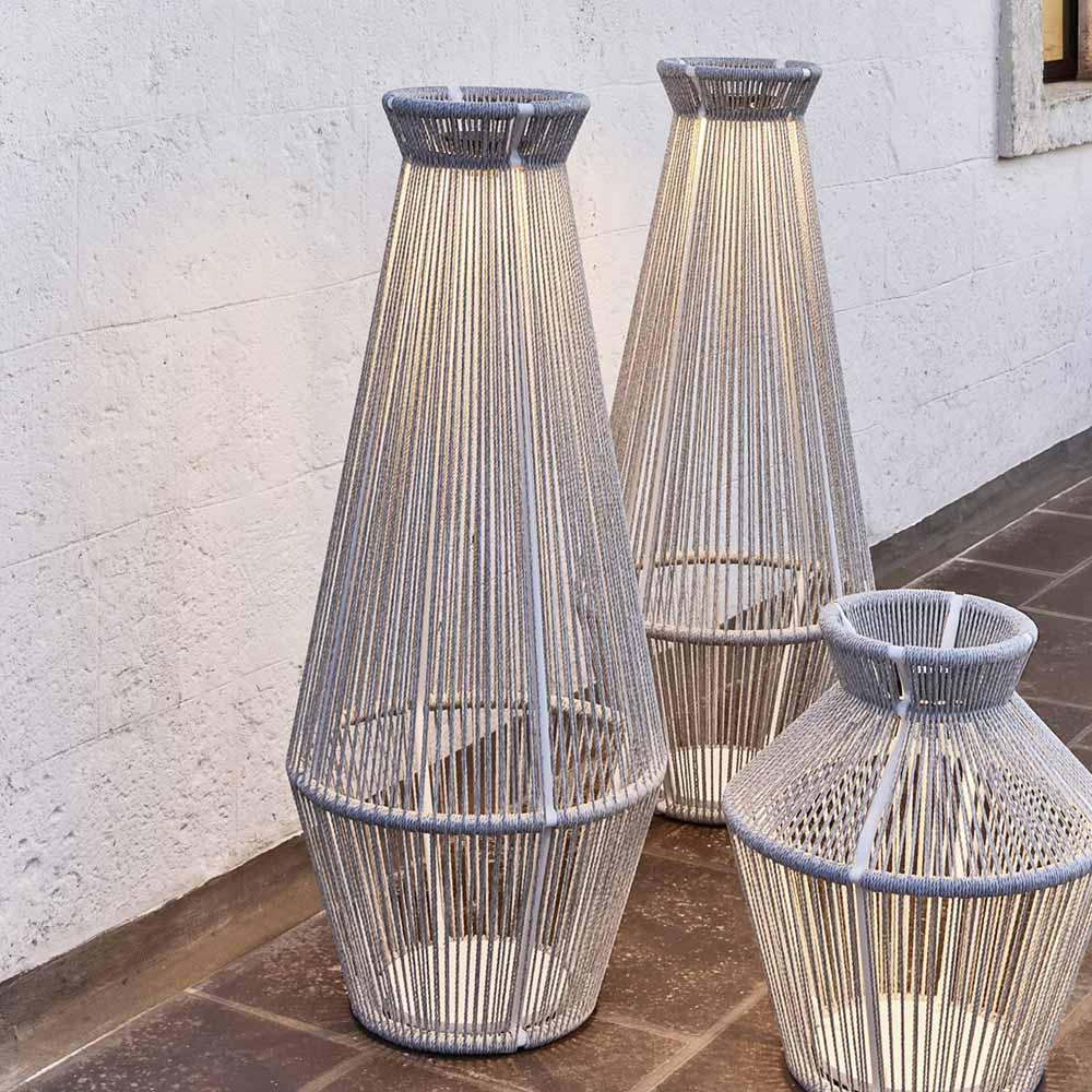 Die vollständig in Italien hergestellte Außenleuchte hat eine pulverbeschichtete Aluminiumstruktur und ein handgefertigtes Gewebe aus Kunstfaser, komplett mit LED-Licht und Vorschaltgerät. Ideal, um eine suggestive Atmosphäre zu schaffen oder bestimmte Bereiche des Hauses hervorzuheben, ist diese Stehlampe die perfekte Lösung, um das Erscheinungsbild der Umgebung zu revolutionieren und ihre Ästhetik zu bereichern.