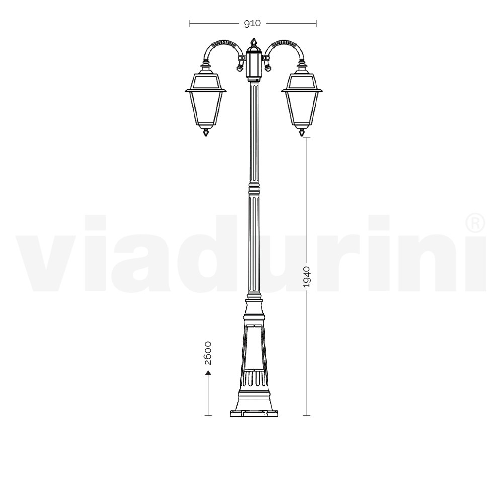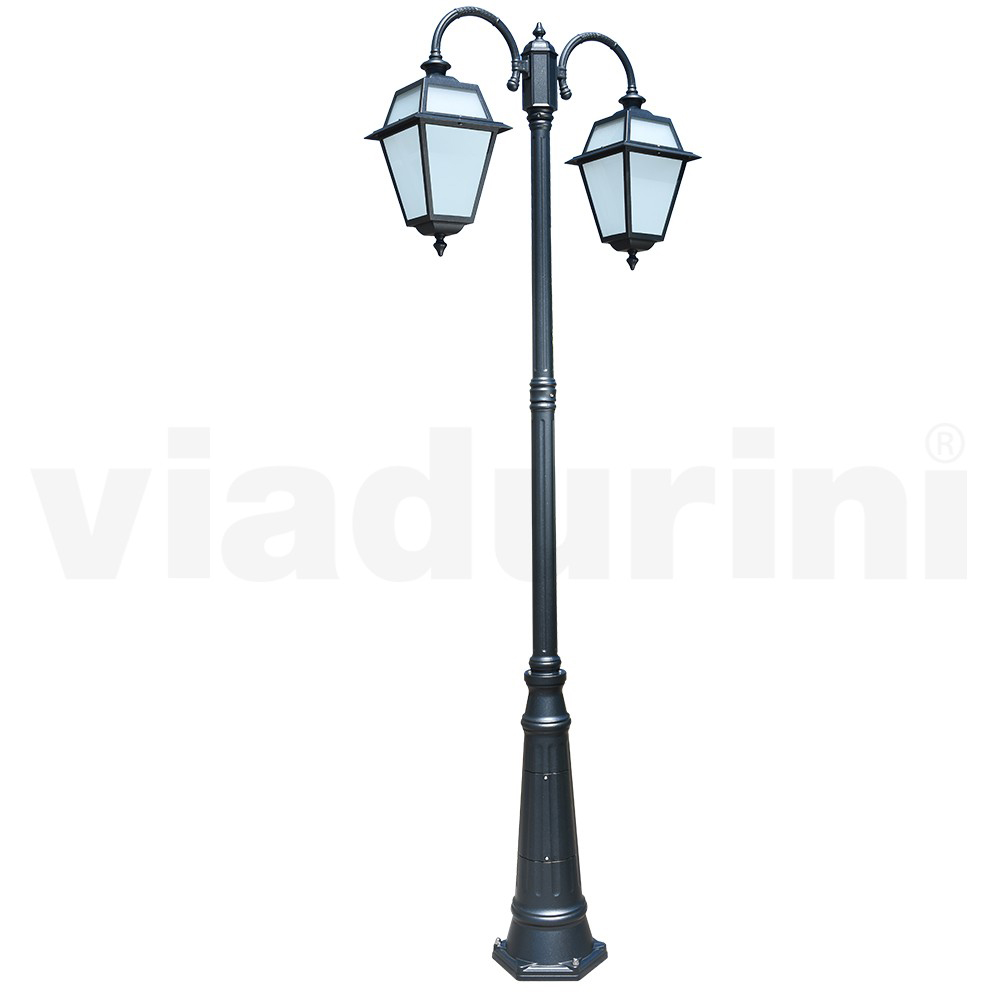 2-flammige Straßenlaterne, komplett in Italien hergestellt, mit Struktur aus Aluminiumdruckguss in Anthrazitgrau und Glasdiffusor . Komplett mit Edelstahlschrauben. Ein Produkt mit einer exklusiven und eleganten Ästhetik, das sich durch wundervolle Details und Dekorationen mit romantischer Seele auszeichnet, die das schlichte Design der Struktur mit einer einzigartigen und raffinierten Note bereichern. Ideal für Außenbereiche wie Gärten, Innenhöfe, Alleen und Gehwege, aber auch für gewerbliche Räume wie Bars und Restaurants.