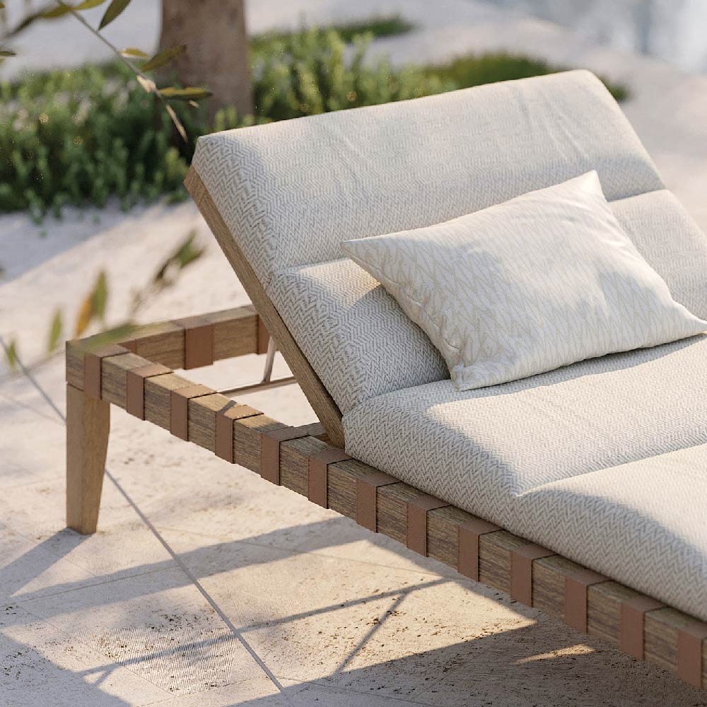 Gartenliege komplett in Italien hergestellt , mit gepolsterten Kissen aus Stoff und Gestell aus verwittertem Teakholz. Die Liege ist in der Struktur mit genähtem Leder verziert. Dieses Produkt mit zarten und essentiellen Linien ist perfekt für alle, die den modernen und minimalistischen Stil lieben. Die organische Form und die skulpturalen Beine verschmelzen zu einem einfachen Element mit harmonischen Proportionen, das sich in jede Außenumgebung einfügen lässt und eine bezaubernde Atmosphäre mit einfachen Linien und Retro-Geschmack schafft. Die für die Herstellung verwendeten Materialien garantieren Qualität und Beständigkeit auch im Laufe der Zeit und machen dieses Einrichtungsaccessoire perfekt für jede Situation und jeden Verwendungszweck.