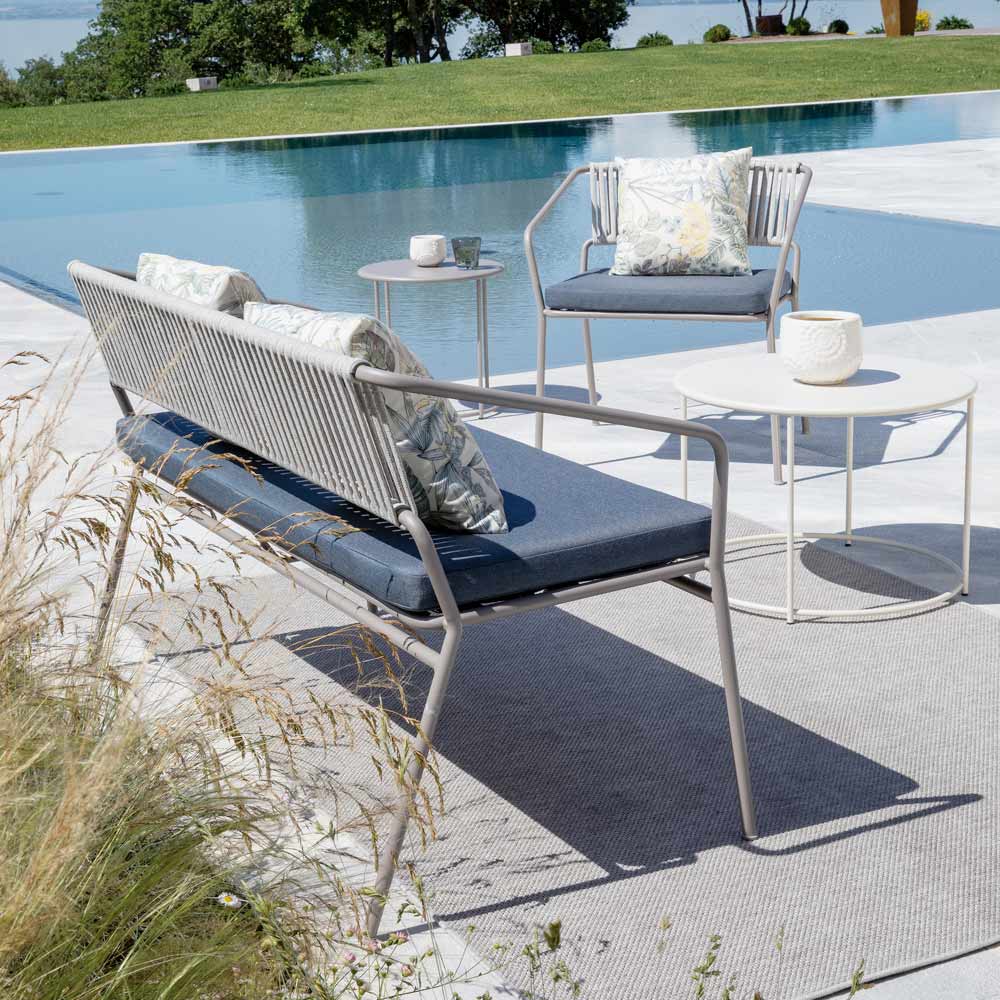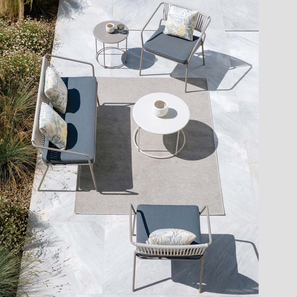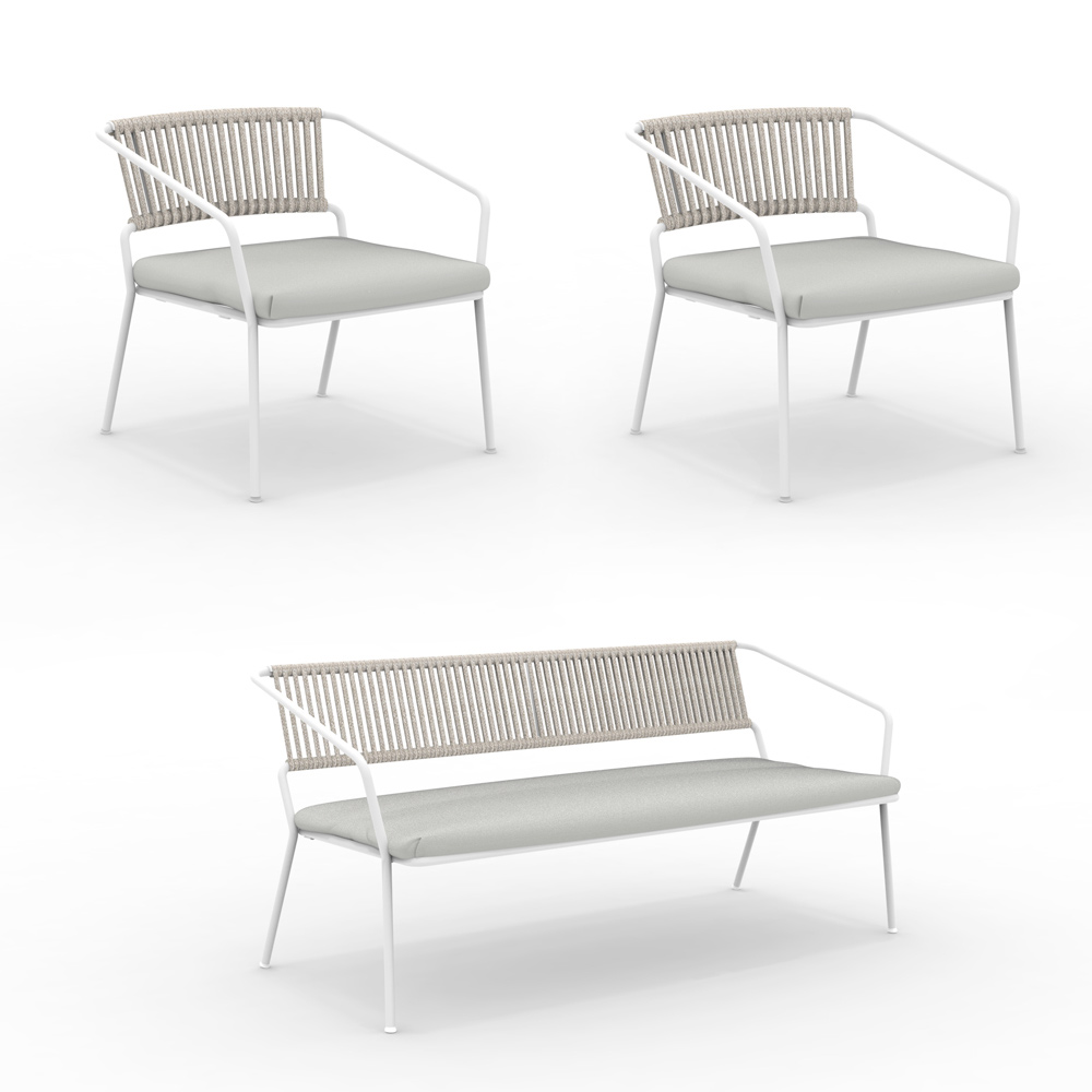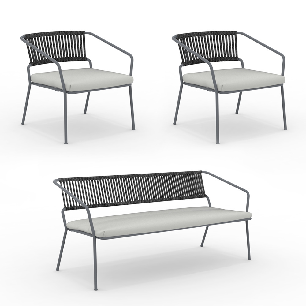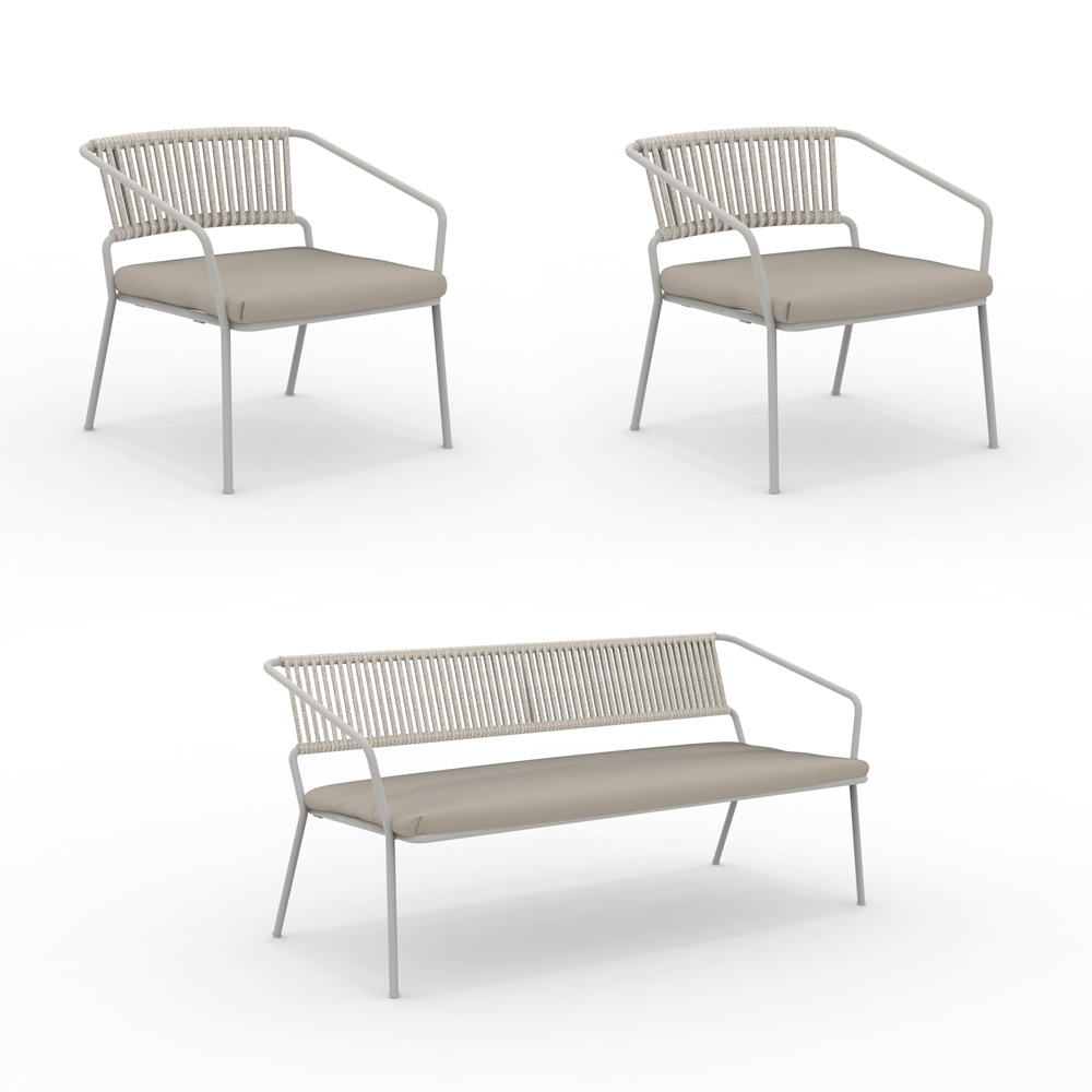 Lounge-Set für den Außenbereich, bestehend aus 2 niedrigen Sesseln und 1 2-Sitzer-Sofa, hergestellt mit einer pulverbeschichteten Struktur aus verzinktem Eisen,Sitzkissen aus Stoff und Rückenlehne aus Seil, vollständig in Italien hergestellt. Diese Gartenlounge ist eine wahre Ode an funktionale Eleganz . Ihre schlanken Linien aus pulverbeschichtetem, verzinktem Eisen reflektieren das Licht in einem Spiel aus Schatten und Reflexen, das verzaubert und einladend wirkt. Der wasserdichte und UV-beständige Polsterstoff ergänzt die Struktur perfekt und bietet weiche und einladende Sitzgelegenheiten, ohne dabei auf Stil zu verzichten. Ob Sie Ihren Morgenkaffee genießen oder den Sonnenuntergang betrachten, diese Lounge ist der ideale Begleiter für jeden Moment der Ruhe und verbindet mühelos die Schönheit italienischen Designs mit Funktionalität für das Leben im Freien.