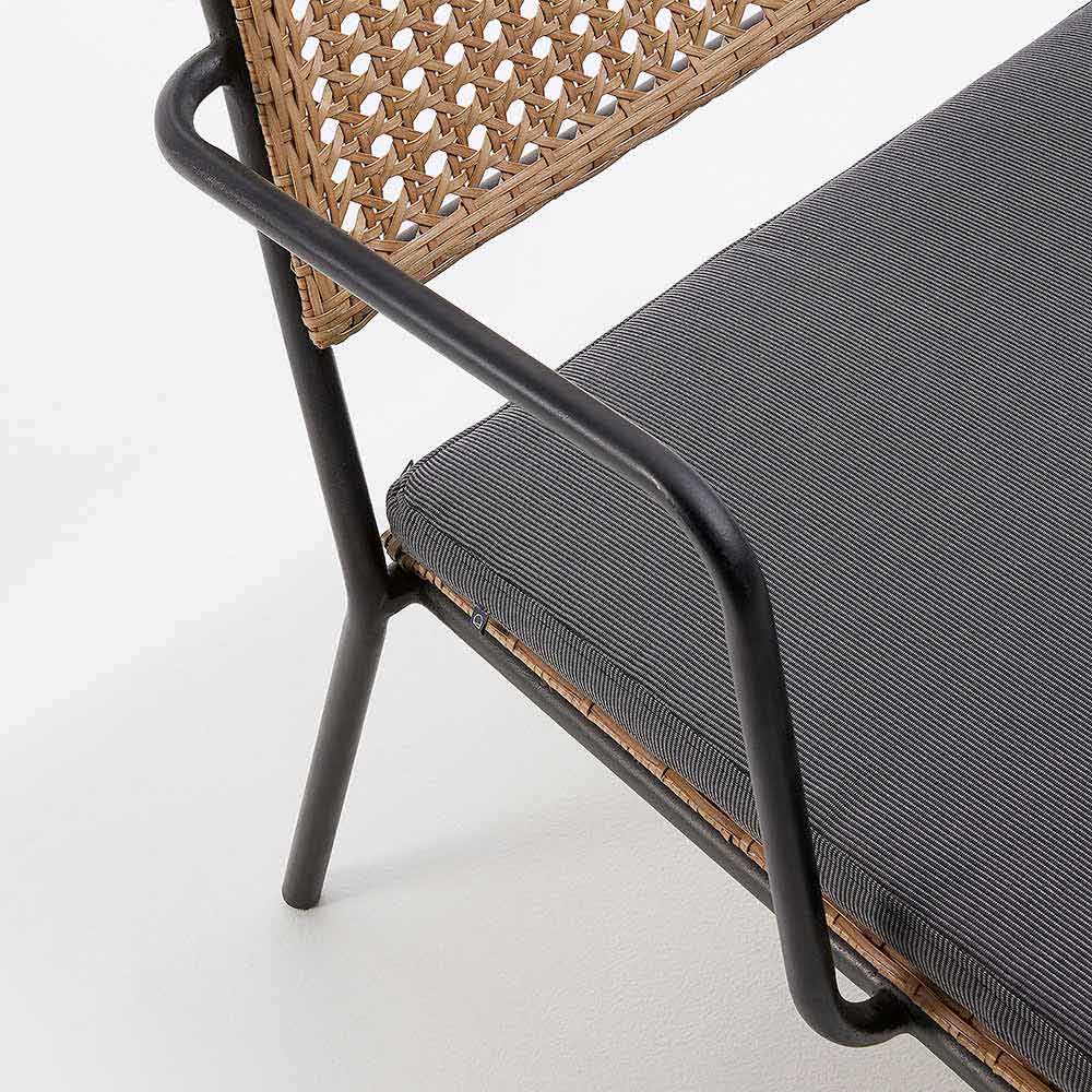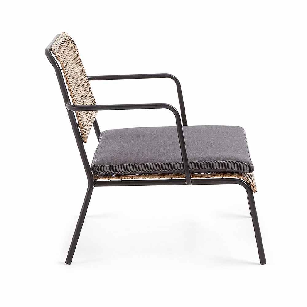 Gartensessel mit schwarz pulverbeschichtetem, verzinktem Stahlrahmen; Sitzfläche und Rückenlehne aus beigefarbenem, gewebtem Polypropylen.