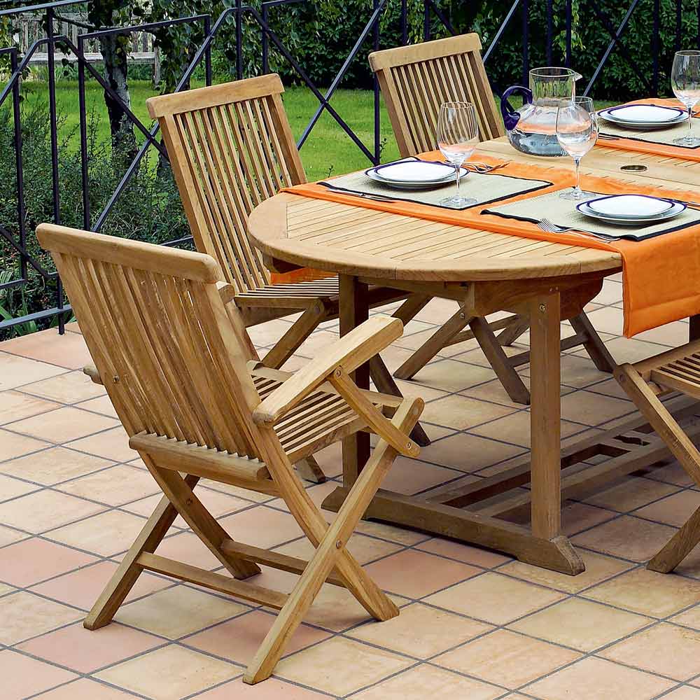 Ausziehbarer Gartentisch mit 2 Sesseln mit Armlehnen und 4 Stühlen aus natürlichem Teakholz . Das verwendete Teakholz stammt aus indonesischer Forstwirtschaft (INDONESIAN LEGAL WOOD). Es ist ein extrem langlebiges , stabiles Material, das beständig gegen Witterungseinflüsse, Pilze, Schädlinge und Insekten ist. Es enthält einen hohen Anteil an natürlichen Ölen , die es widerstandsfähig machen und die Feuchtigkeitsaufnahme begrenzen .