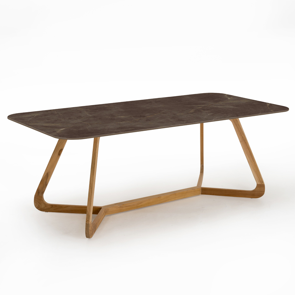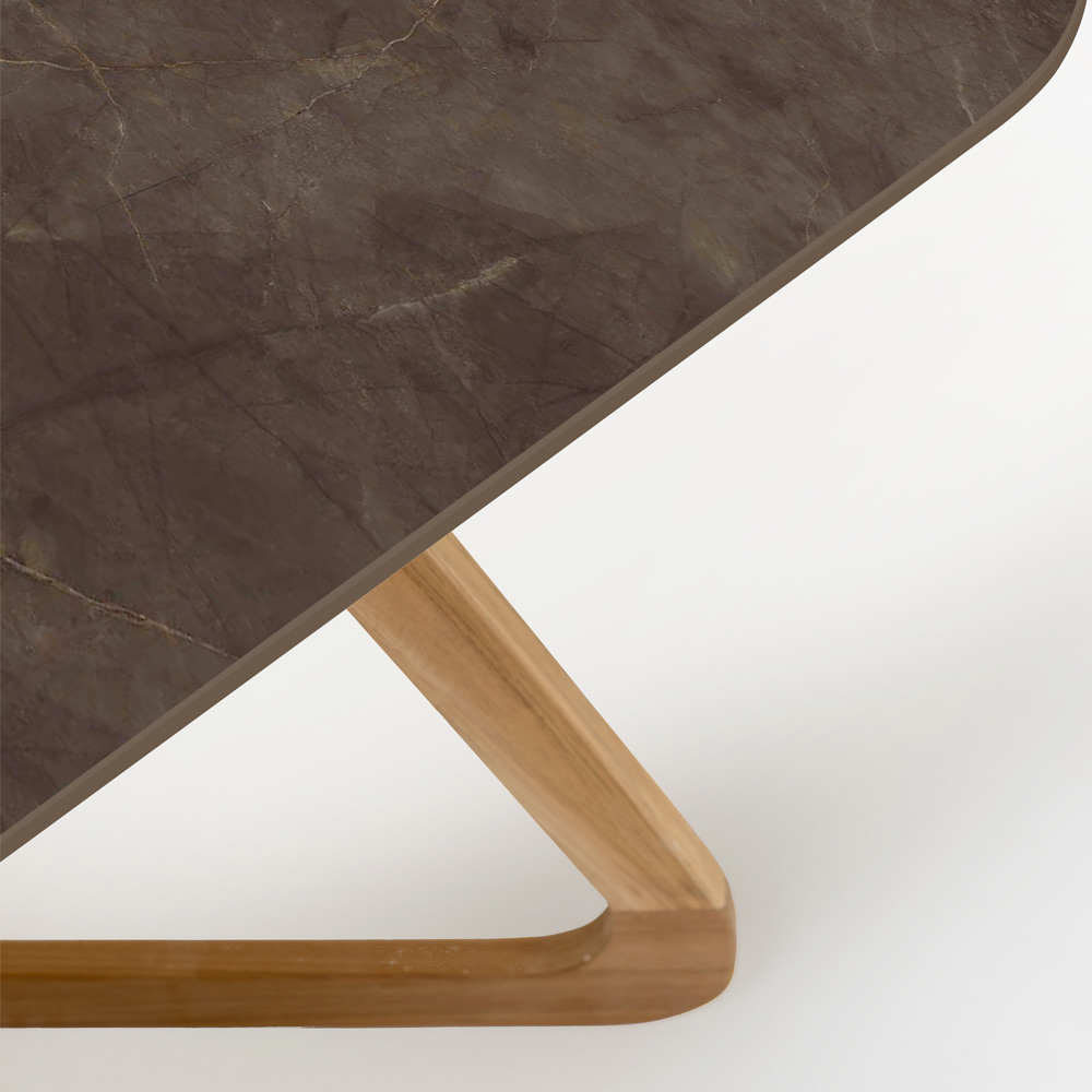 Tisch für den Außenbereich mit einer Basis aus massivem natürlichem Teakholz (35 mm dick), einer Infinity-Platte aus Steinzeugkeramik (12 mm dick) mit mattbraunem Pulpis- Finish und einem Untergestell aus Okumé-Bootssperrholz , vollständig in Italien hergestellt.